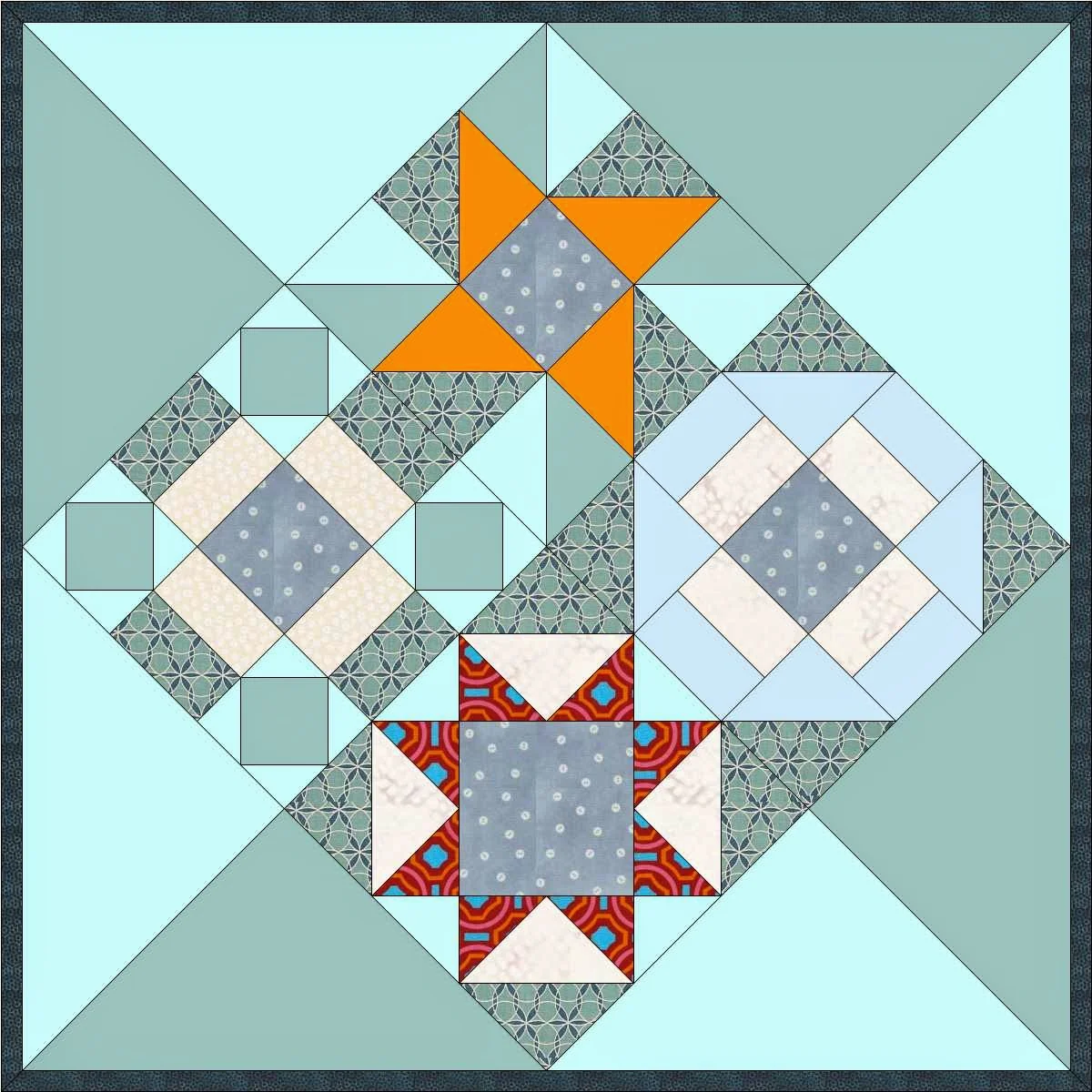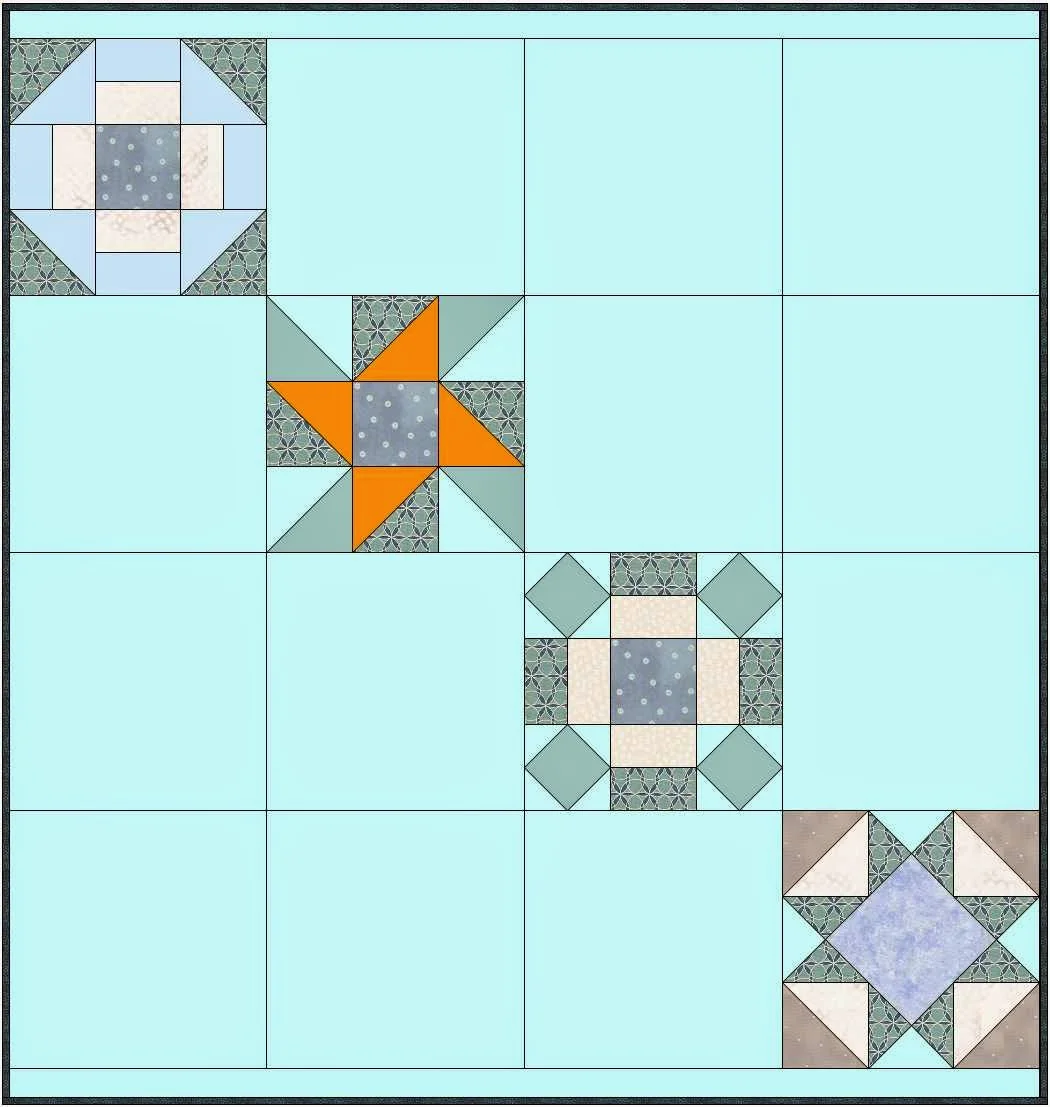 lesson. Block 4 is "Rolling Stone." This lesson was focussed on designing a quilt. I wasn't expecting to get a quilt out of 4 blocks, but we did!