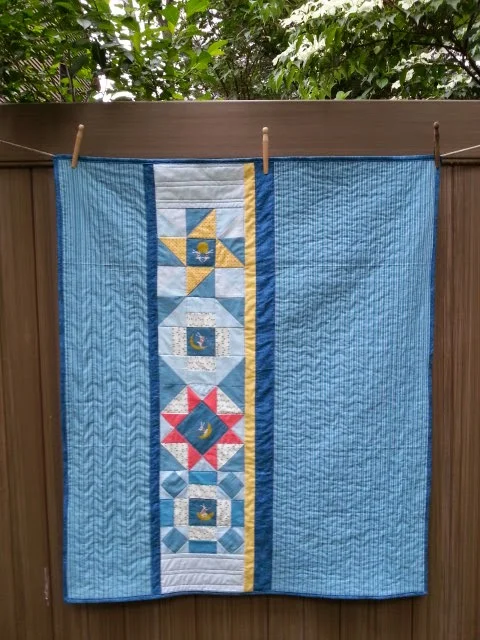 Here is my EQ7 Jump Start quilt! I love the bunnies in the center of each block. The quilting in the negative space is vertical lines--close together on the right, further apart on the left. It's going to have great texture when the quilt is washed and dried.