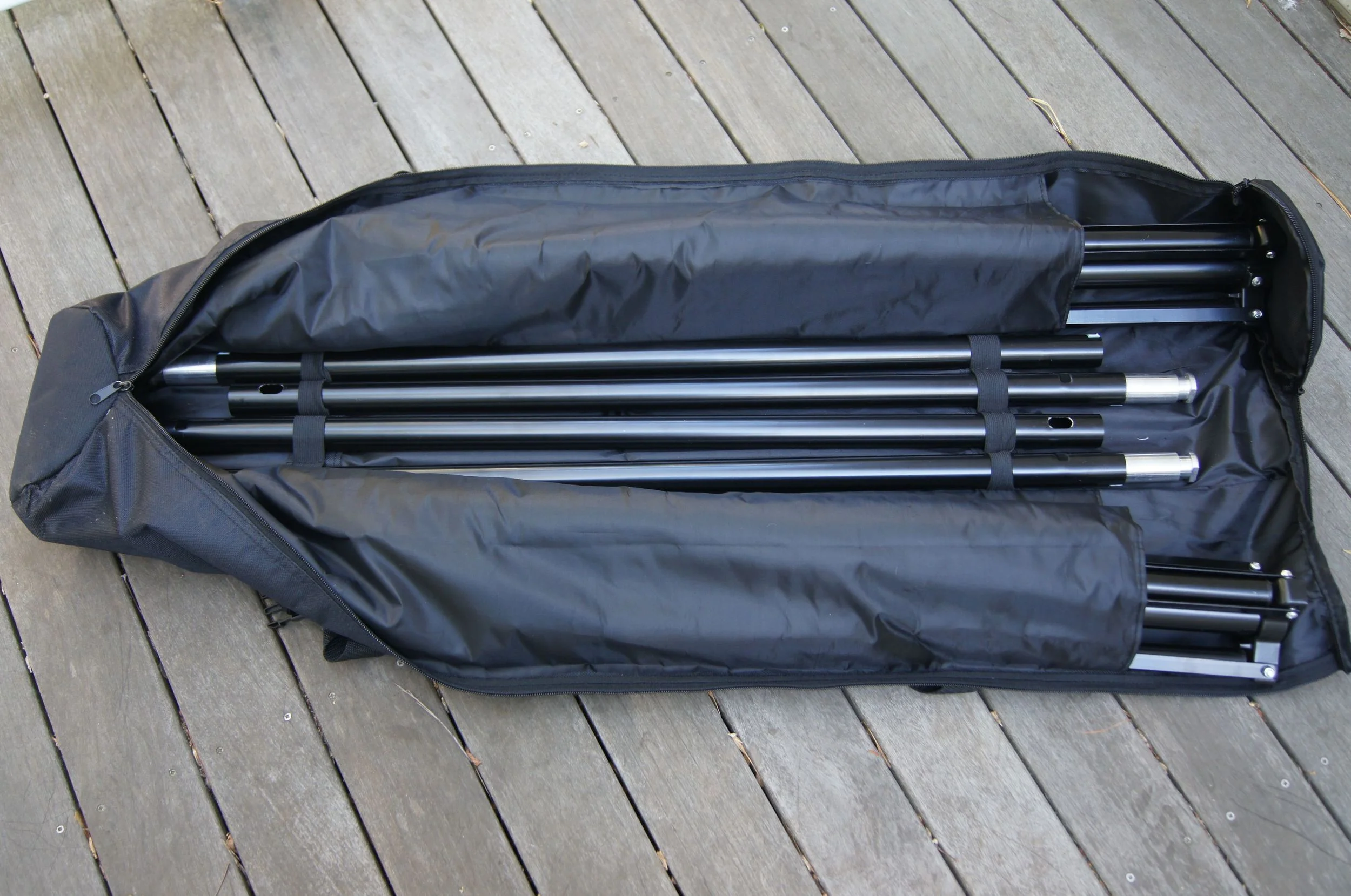 The frame is really nice and sturdy. The bar across the top of the frame comes in four 29" sections. This makes it possible to hang a quilt any size up to 115 inches wide. The upright bars of the frame telescope into each other. They are on an air cushion so they bounce, rather than crash down, when being raised and lowered. The top of the frame be raised as high as 102 inches off the ground.