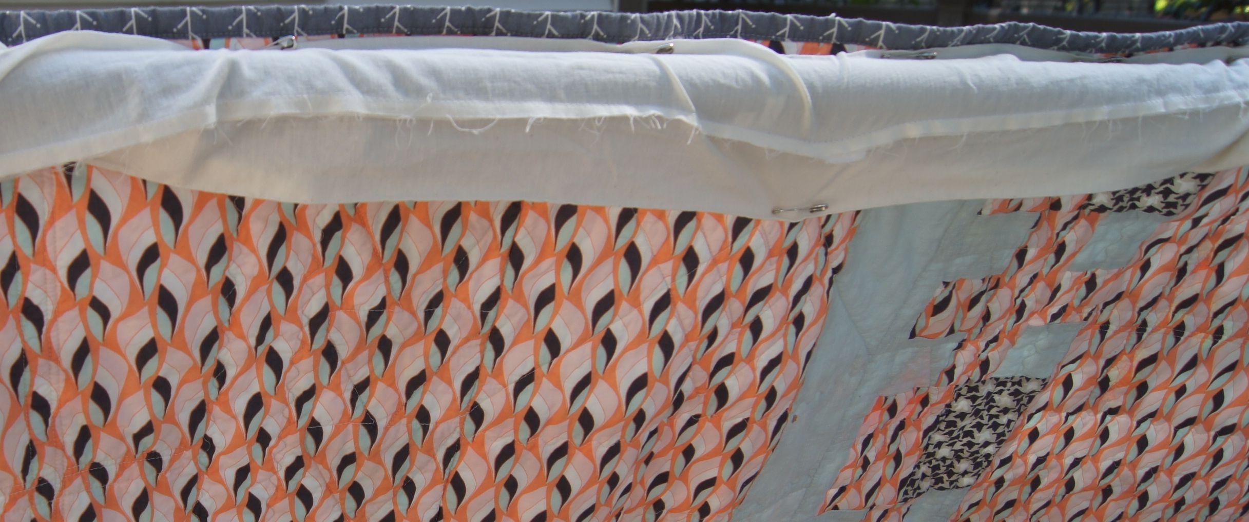 Back of the quilt with a sleeve pinned on and the bar of the frame inside the sleeve.