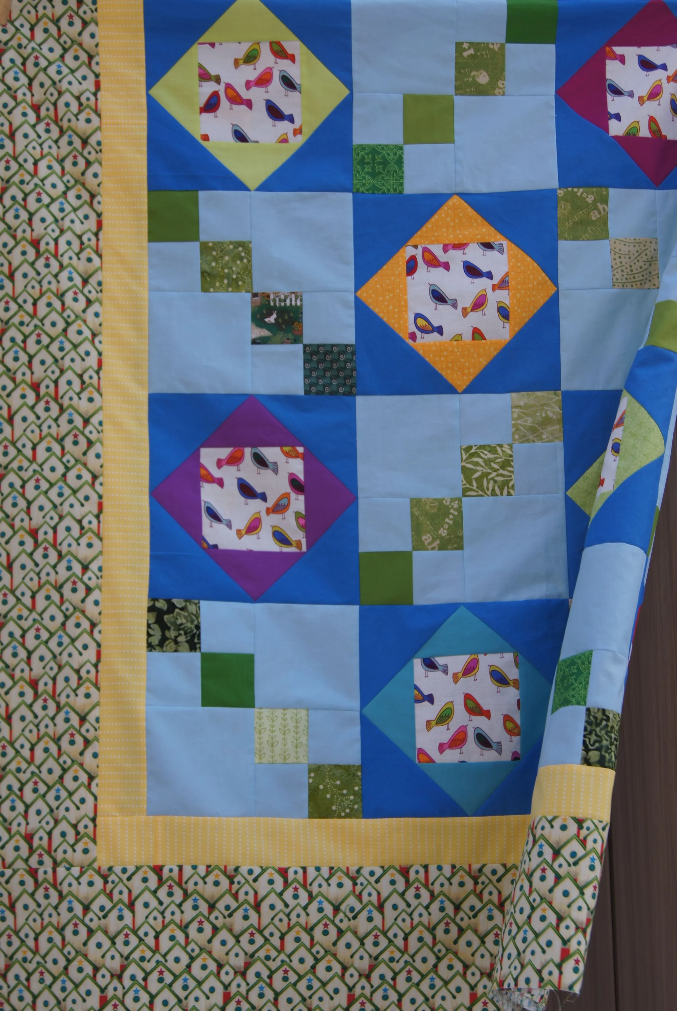 I found the this birdhouse fabric, "Country Folk Wurk [sic] by Cranston Village, while this quilt was still in the "thinking" stage. The steep roofs on the birdhouses were the inspiration for using the Economy Block as the focus block in this quilt.