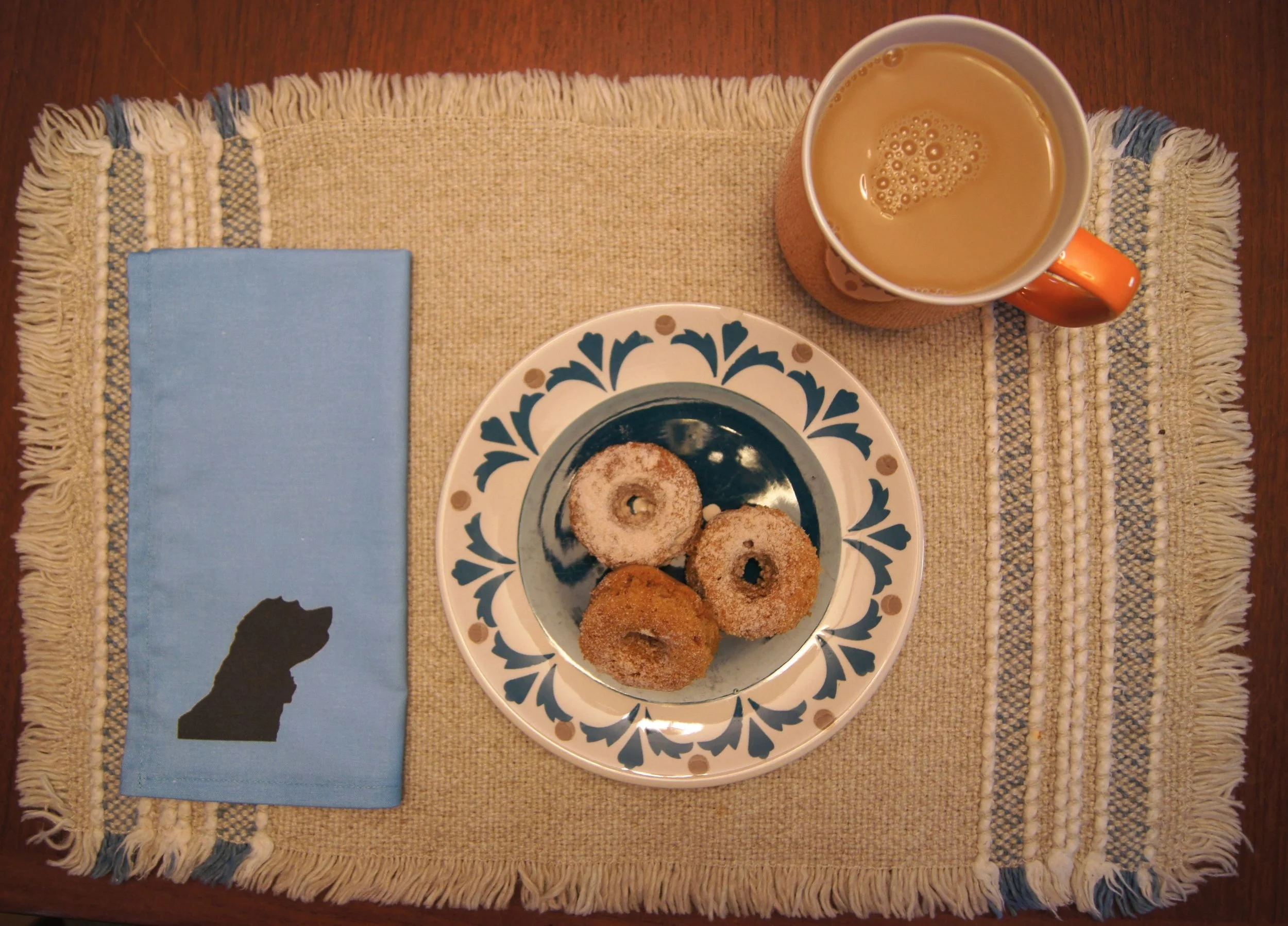 Shadow Play Table Napkins with baked mini donuts and Chai tea