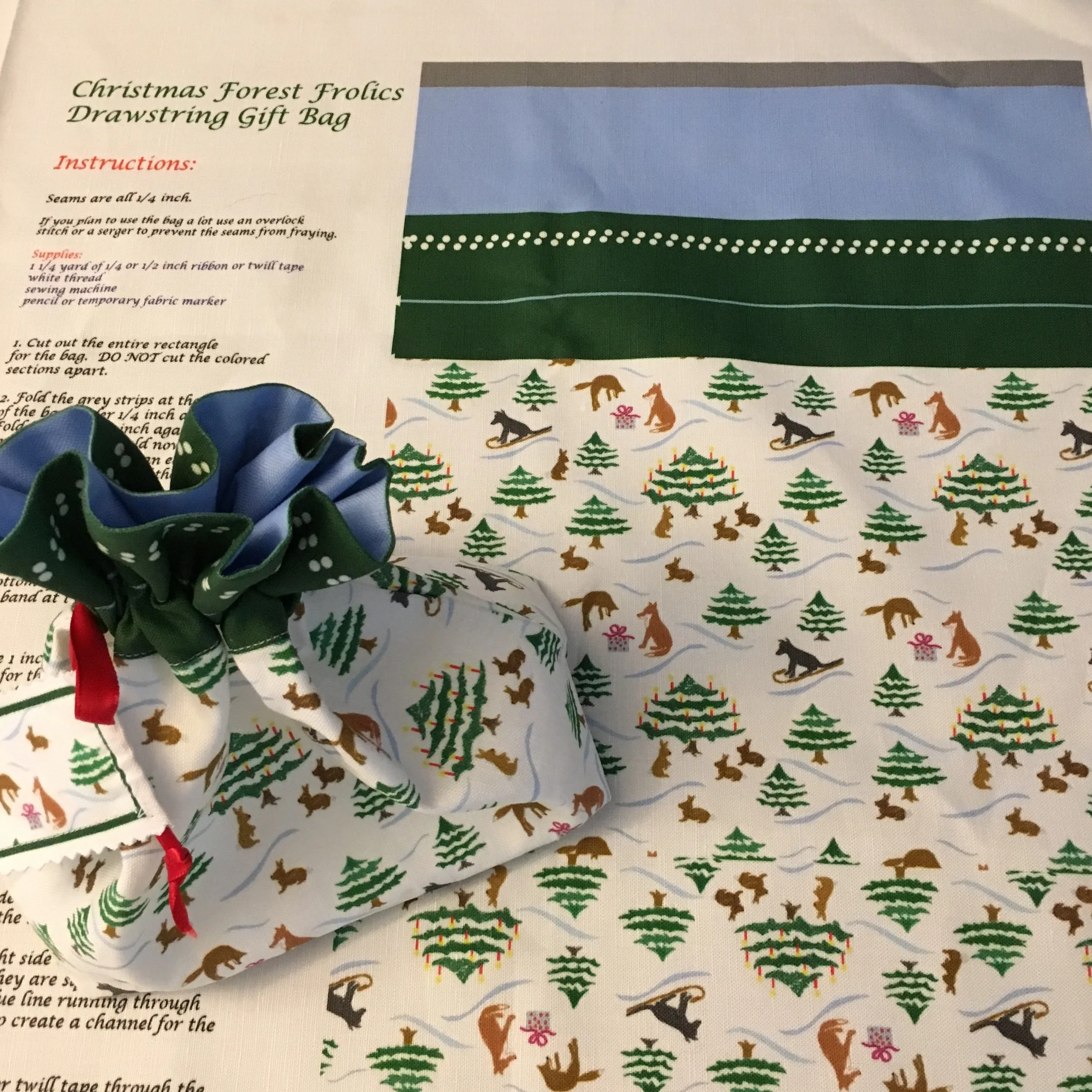 Here is the link to the finished product for sale at Spoonflower.com: Christmas Forest Frolics Gift Bag. 4 seams and it's a sweet little bag for Christmas gift giving! It measures 9 1/2 high x 9 3/4 inches wide, with the gift area in the finished bag approximately 6 1/2 inches x 7 inches.