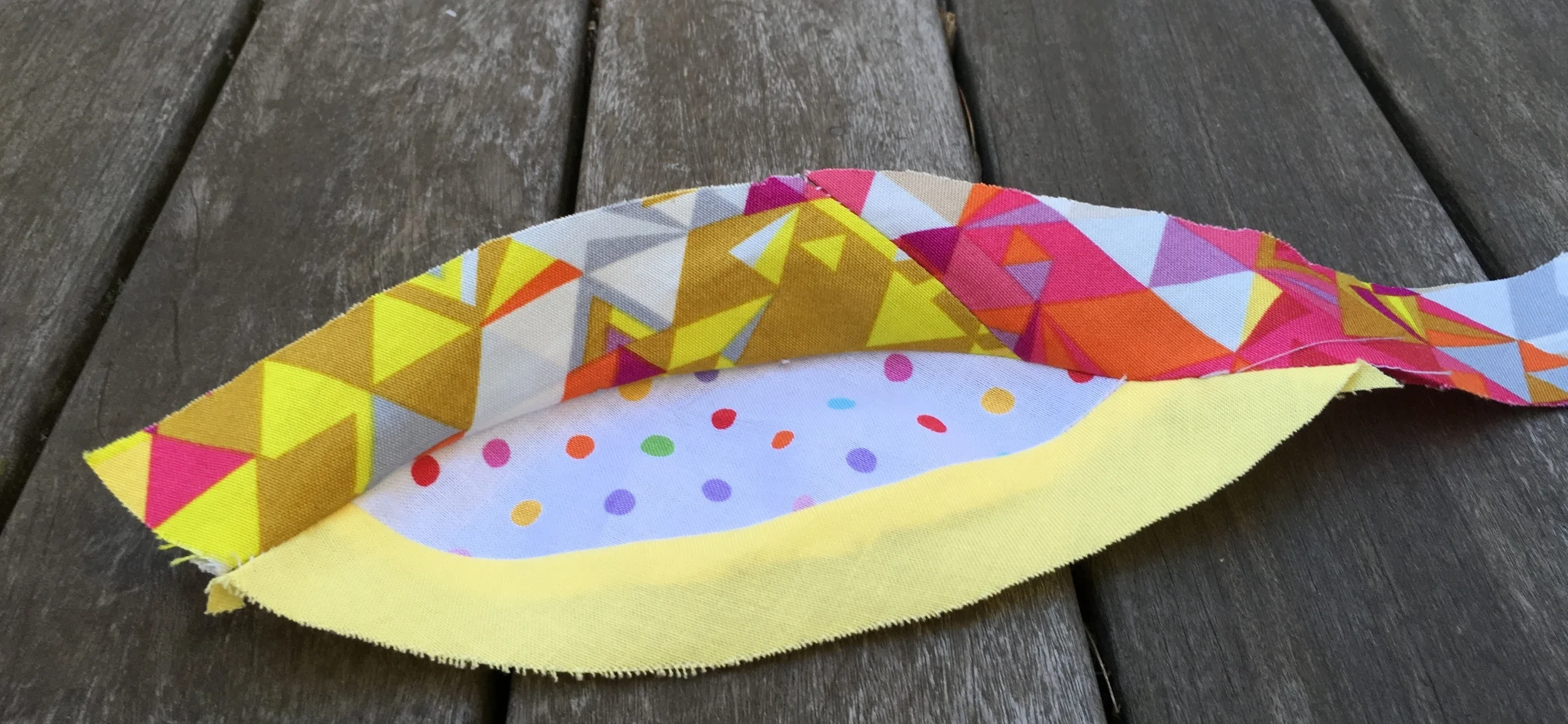 I should have taken photos as I started making the petals. The first strips on on each side of the oval petal went were nice and flat. It was all downhill from there. I tried pinning the bias strip, then not pinning an letting it float pulling on the pieces more and then less as Sherri recommended. The strips just didn't lie flat for me. Below is a photo of one petal I made just to show here. In this one, only the first strip worked out.