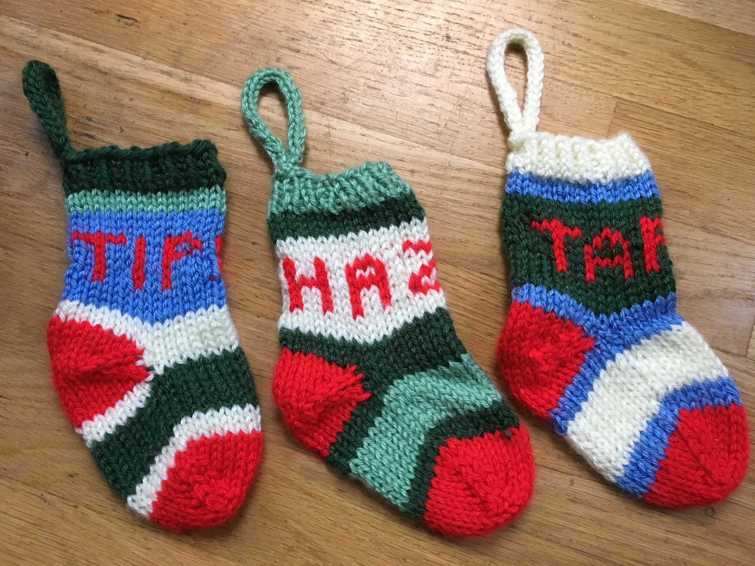 Above are three 7 1/2 inch hand knit Christmas stocking for my dogs...Tipper, Hazel and Taffy! The were made by my friend Edith, constant knitter, calligrapher and fine printer. What lucky dogs to have their own handmade stockings!