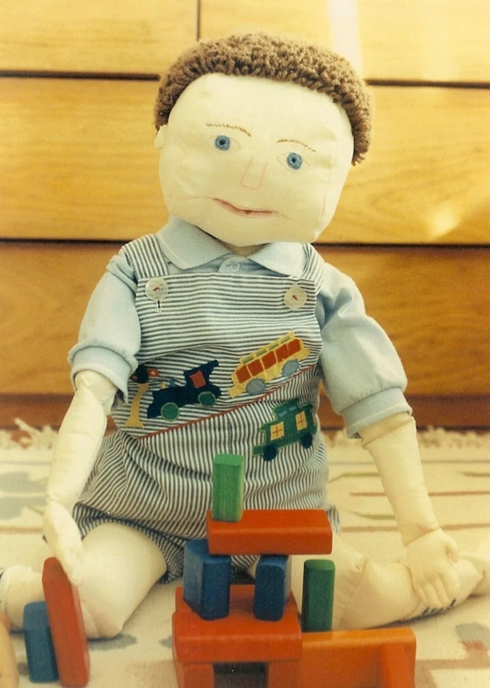 This is Timothy. He's the size of Toddler and wears size 2T children's clothes. I designed him after I'd become a Nurse Practitioner. I had worked for several years at a children's hospital and then moved to primary care pediatrics at a large Health Maintenance Organization (HMO). I made Timothy for the Child Life Specialist who worked in the Pediatric Departments across the HMO. By this time I had a good idea about what medical procedures were really stressful for children. Young children learn by looking and touching. They can't follow a lot of talking explanations. Showing a child what is going to happen and letting them do it too, helps to decrease anxiety. Decreasing anxiety helps the child better cope and better cooperate with what needs to be done.