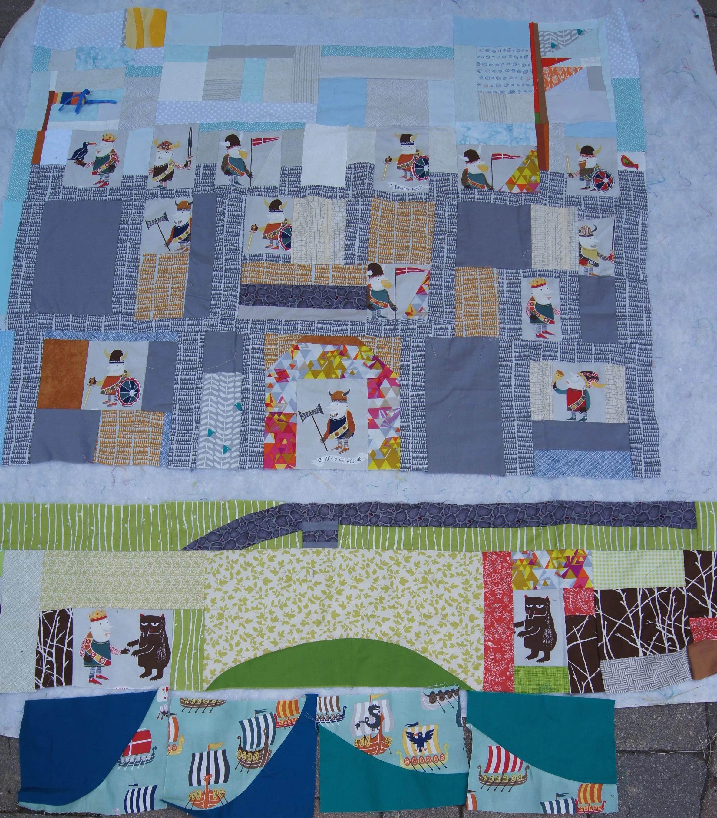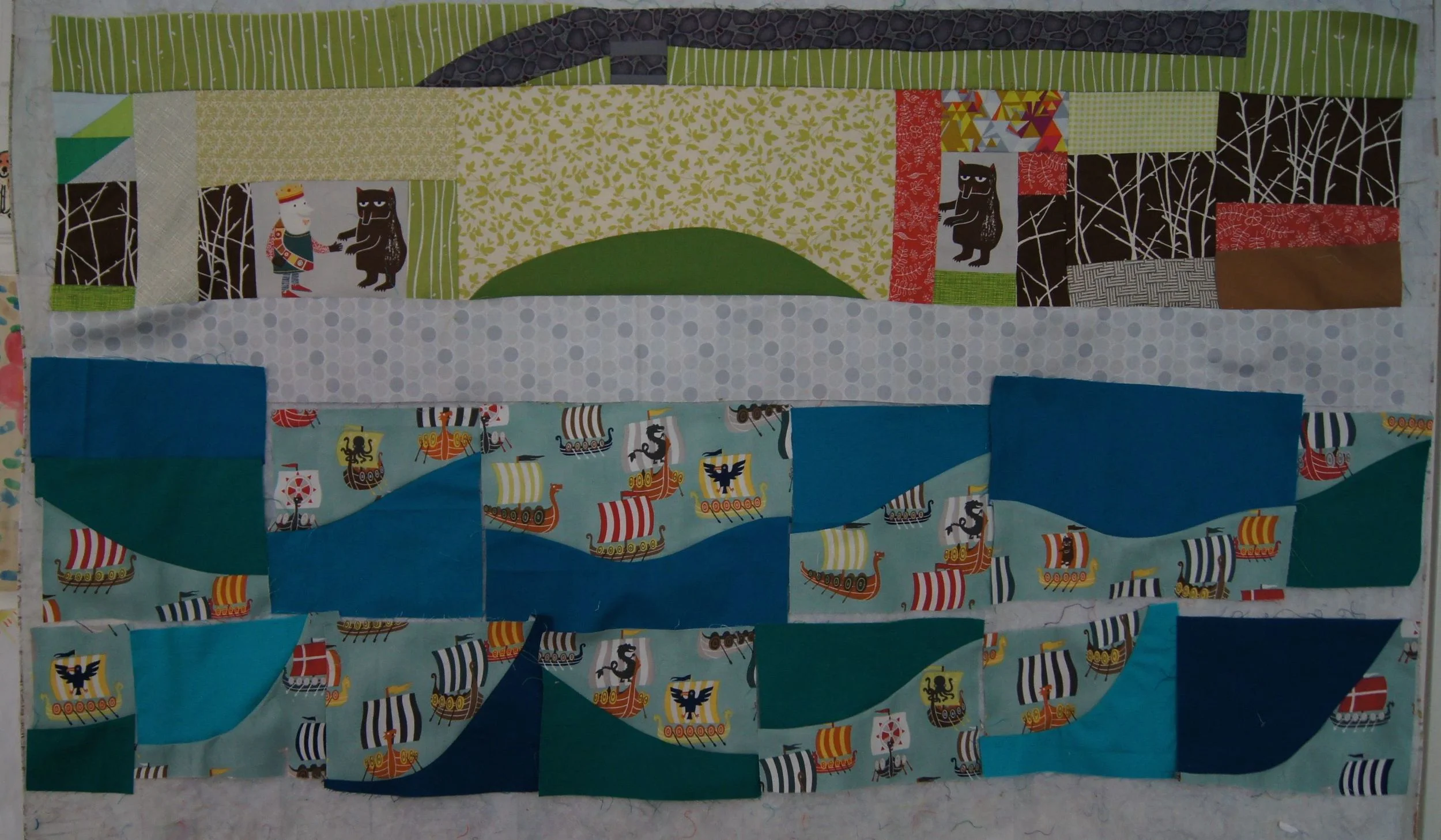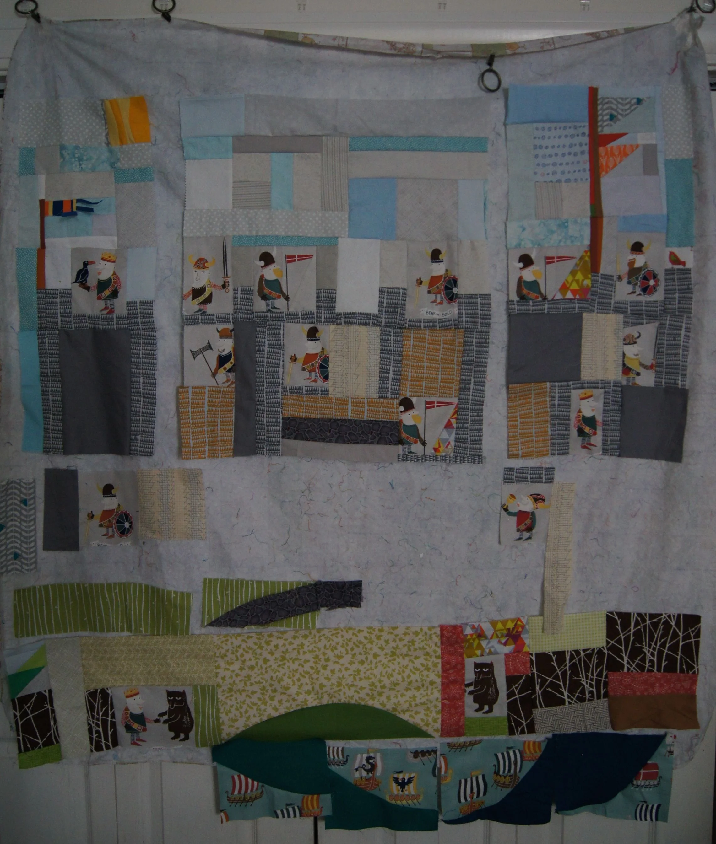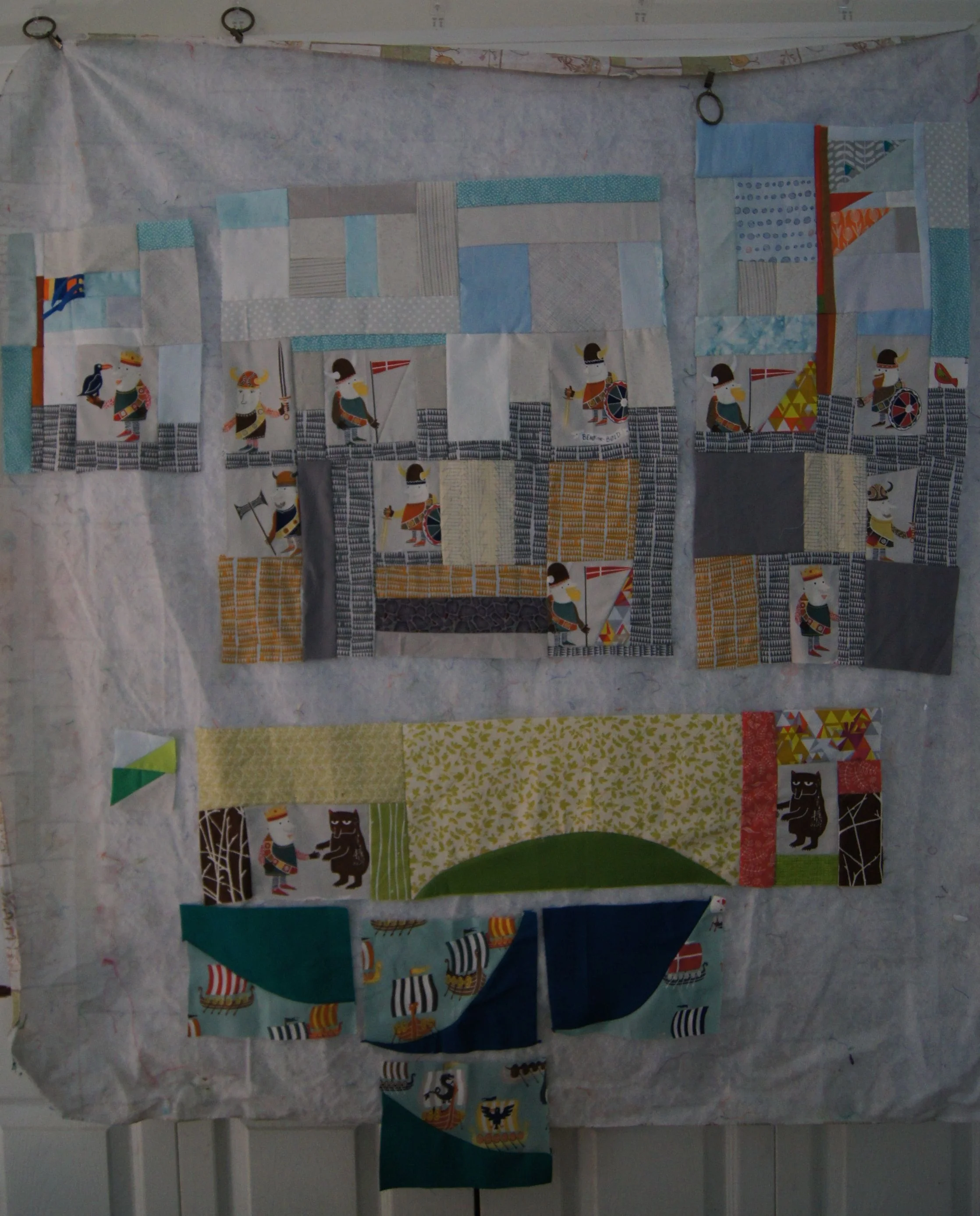 While the construction of this quilt is done using Modern Improv guidelines, the fact that the Viking fabric was fussy cut and the quilt is going together like a storybook, makes it unusual in the Modern quilt genre.