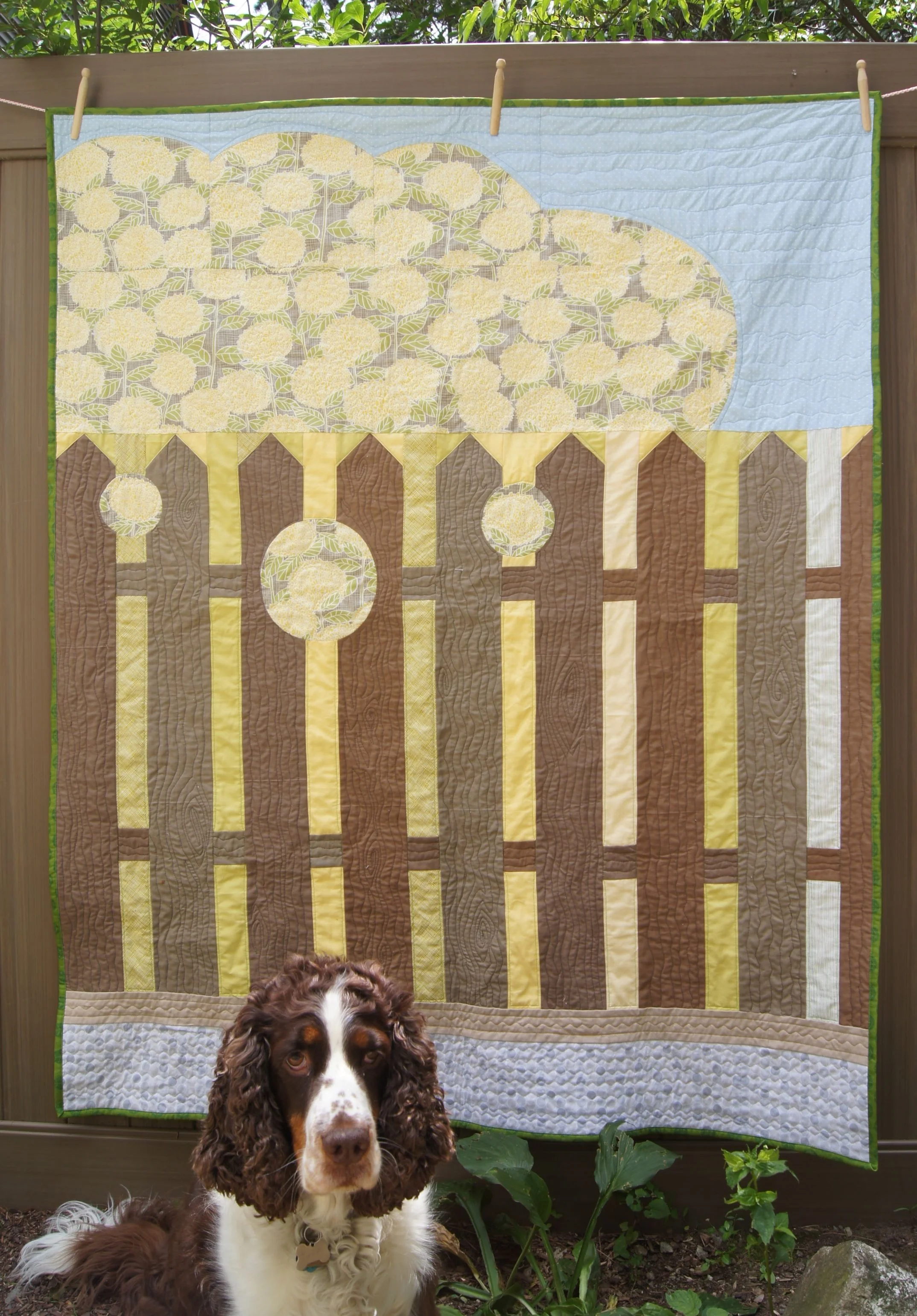 Here is the completed Fence Quilt with the neighbor's hydrangea, peaking over and through the fence!