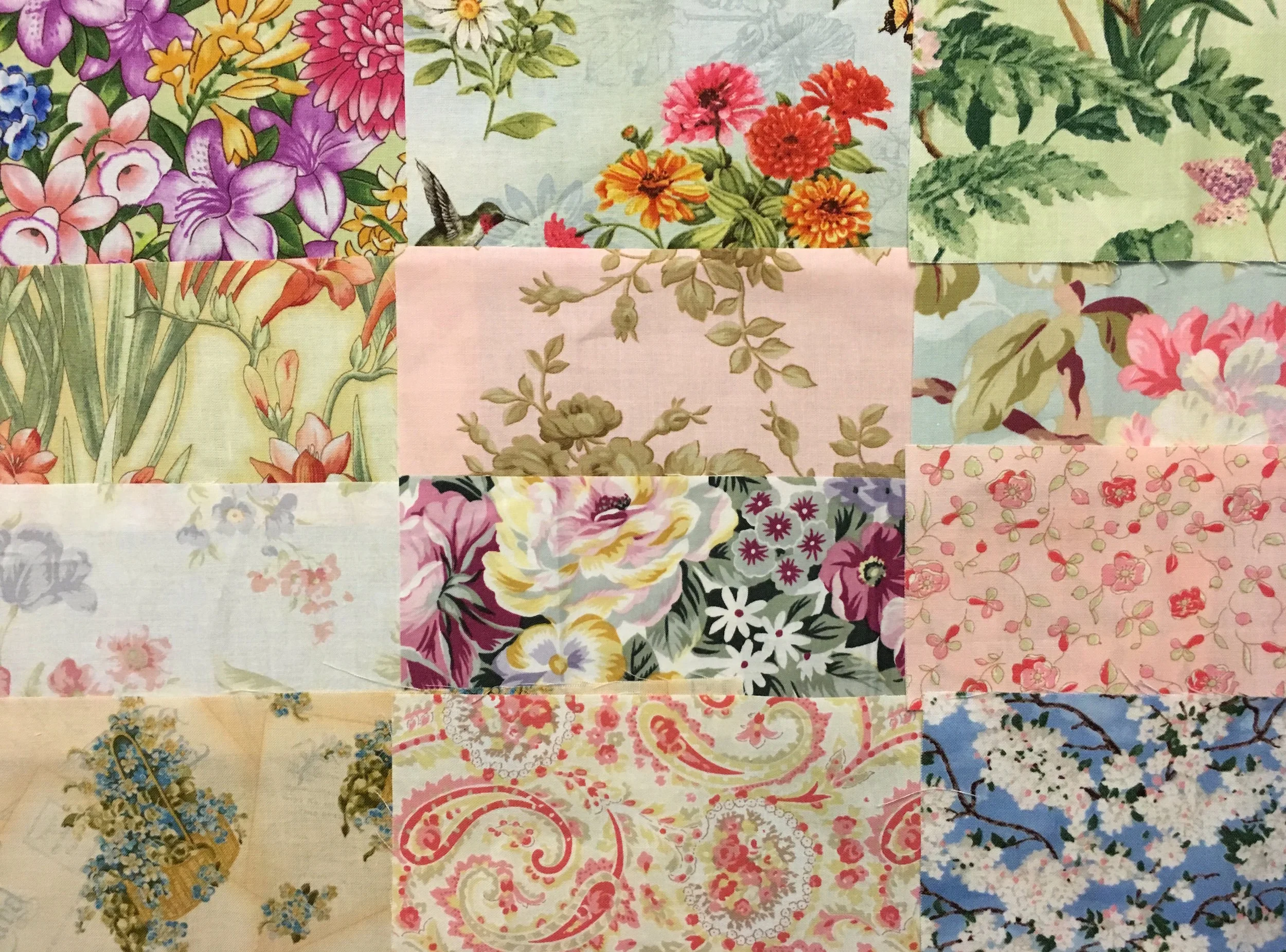 So I wasn't surprised when I found myself digging down to the bottom of one of the bins in my stash, looking for the "Sew Chic" stack of 10 inch square florals that I purchased from Keepsake Quilting a couple years ago. This collection has lots of large print flowers and a few of smaller scale.