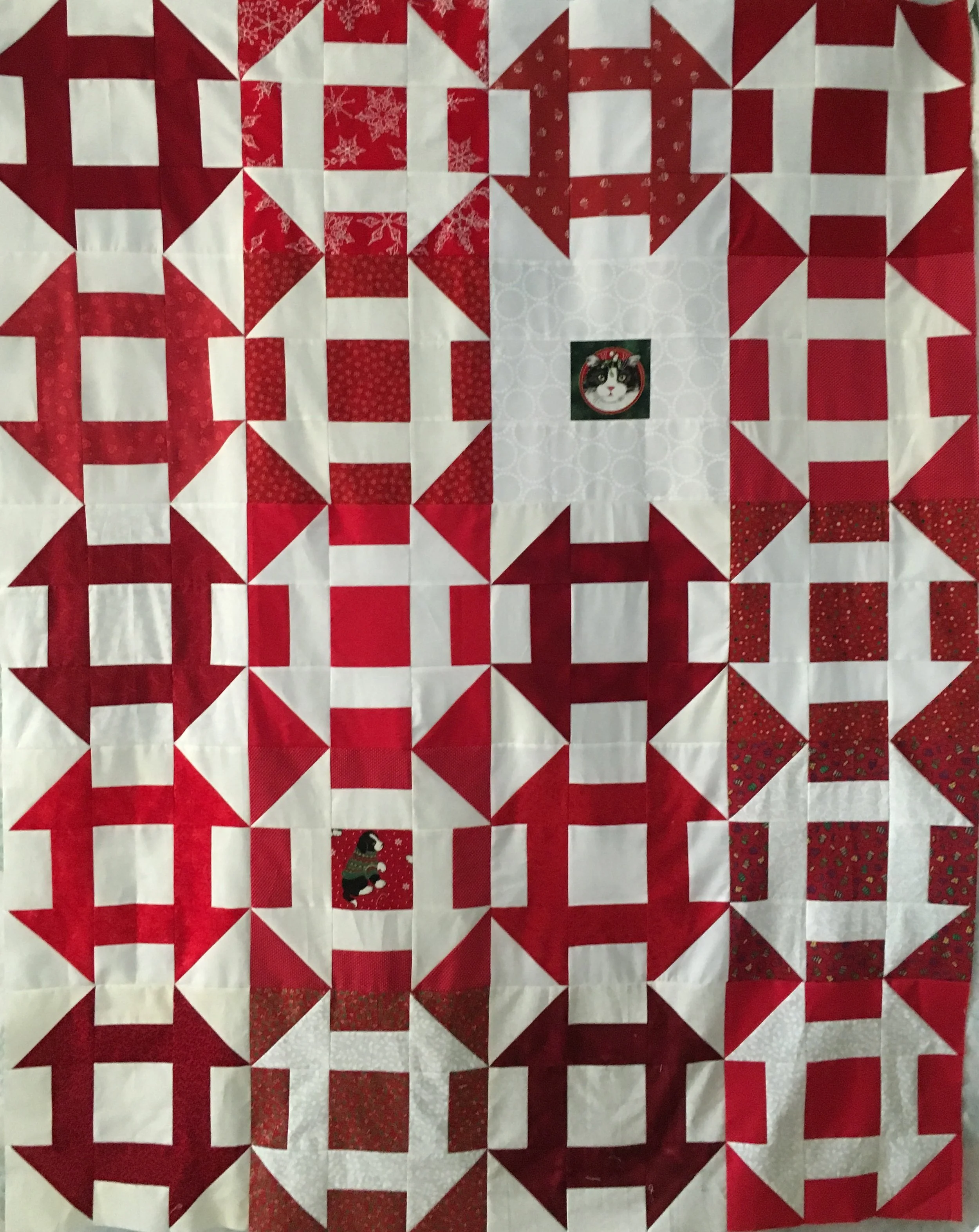 Nine 12 inch blocks is half a lap size quilt. Clearly I needed to make more! I'd been thinking about what I would do if I won. Opposites and Disruption were on my mind! So I whipped up 10 blocks with white bars on an assortment of red Christmas fabrics (opposites) and one Cat in a Circle block (disruption, in more ways that one)!