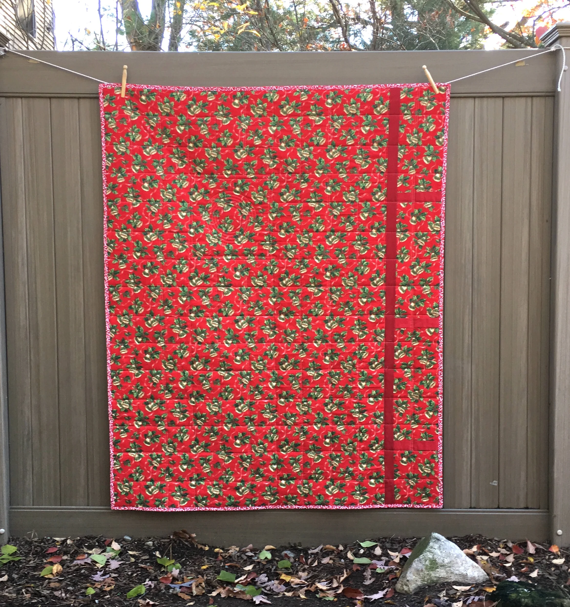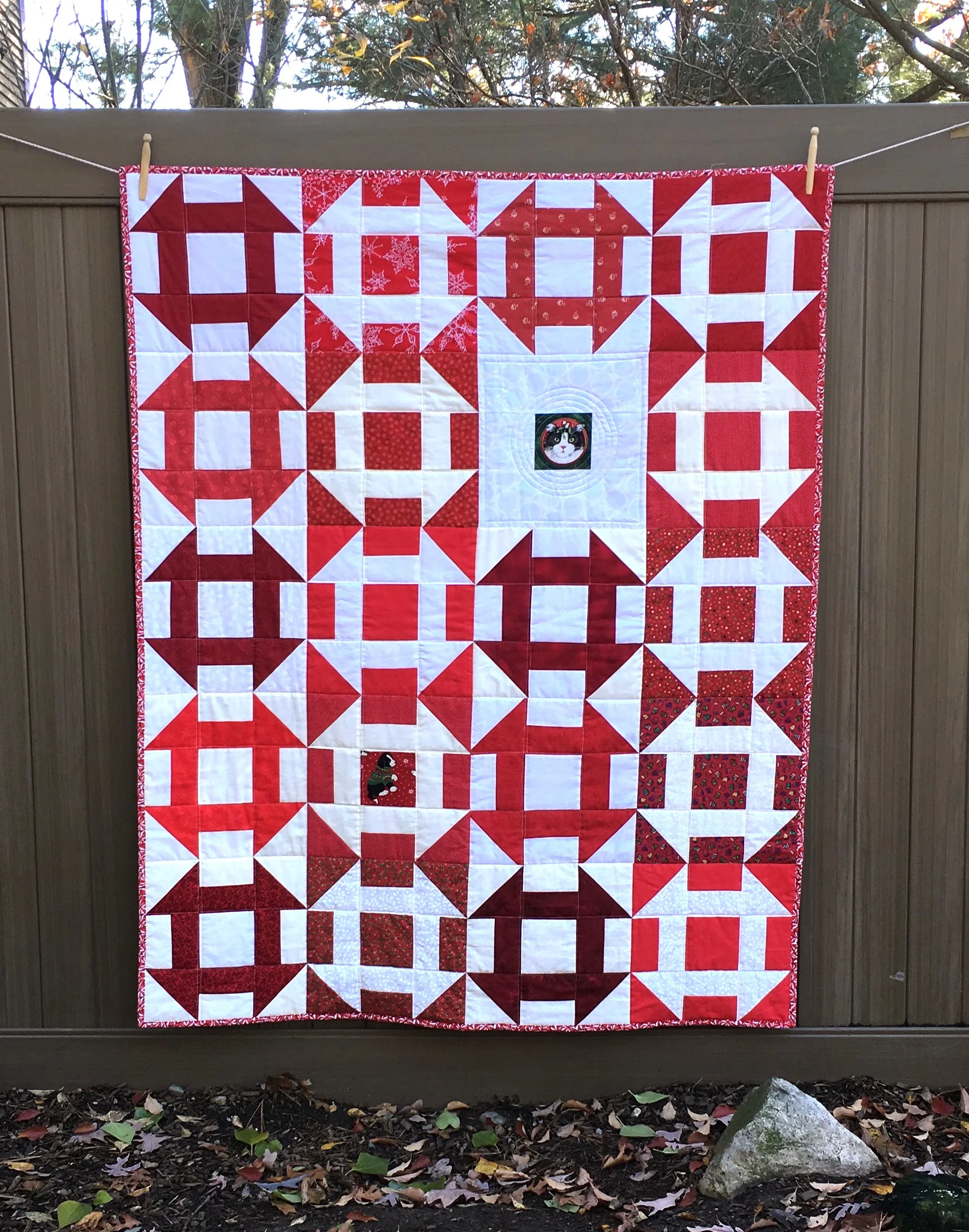 Another finish to share today! This is the Churn Dash Christmas Quilt I made using 9 red on white background churn dash blocks from the October block of the month at the Proper Bostonian Quilters Guild.