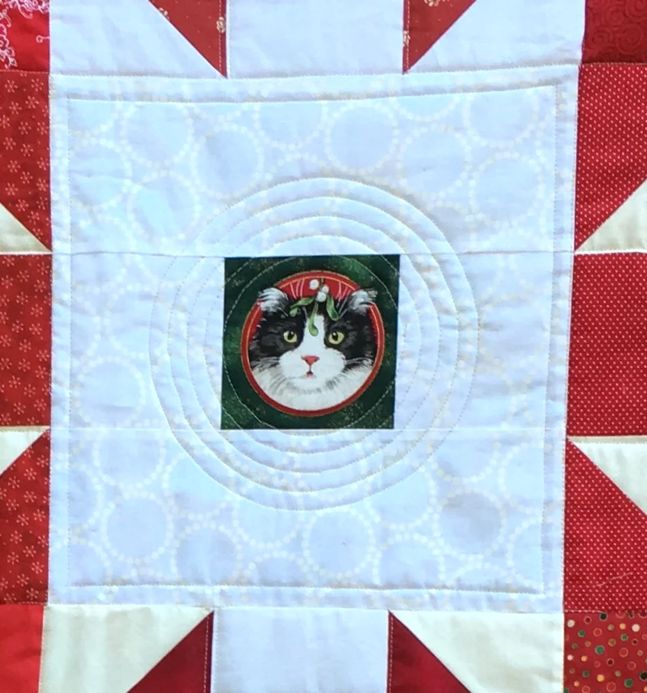 I quilted around the margins of the cat block and quilted concentric circles around the cat. The inner circle is quilted with dark green thread and the next to last circle is quilted with very pale green. Most of the thread used for quilting is a very light silver/grey color. That grey looked much better white on the quilt's red back.
