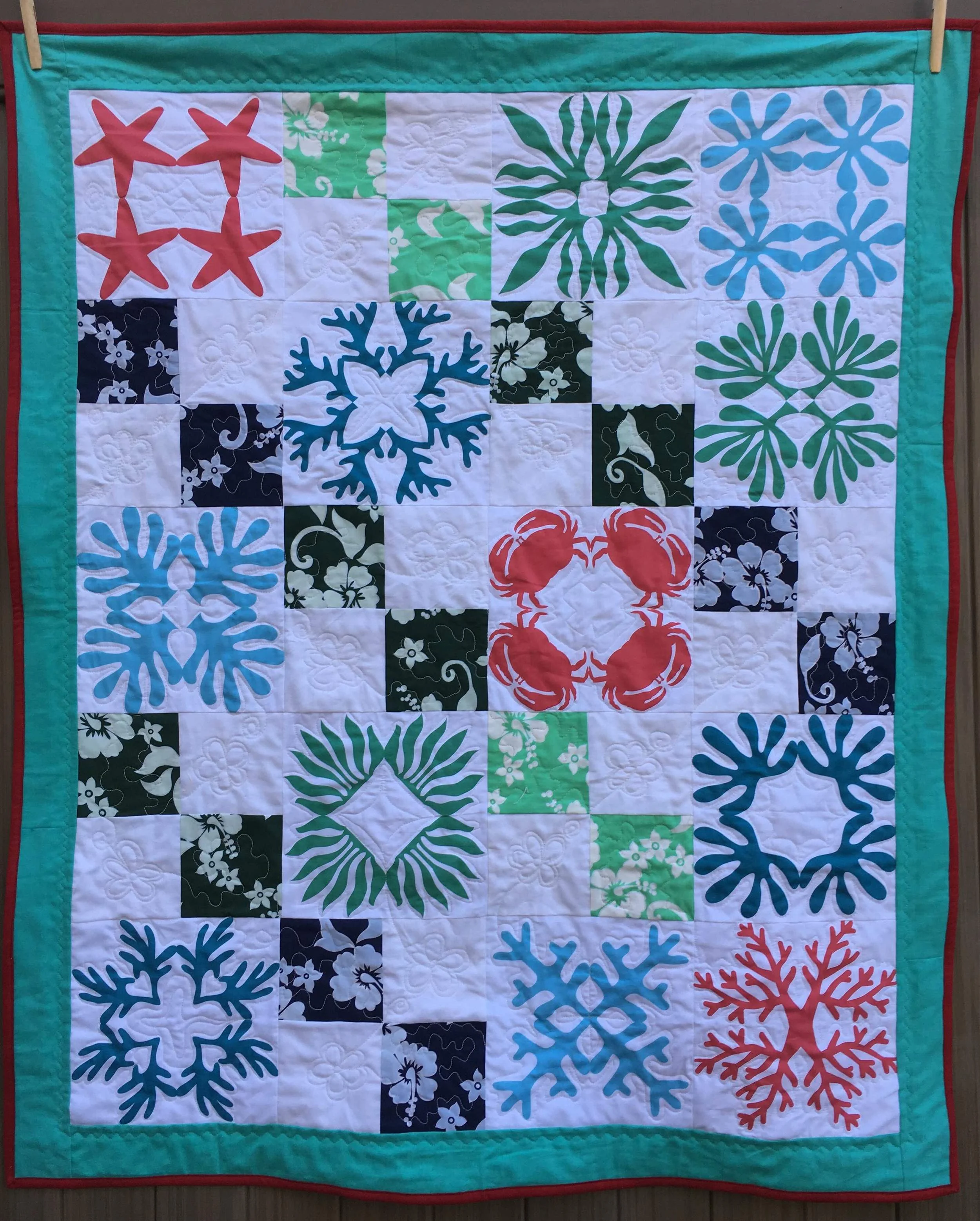 Here's my completed "Hawaii at Home" quilt using the "cheater" panel "Matisse's Seaweed" from spoonflower.com (see my post March 3, 2016 for more details about Jeni's panel). Also included are 4 patch blocks with actual Hawaiian print fabrics. There is also a Hawaiian print fabric on the back of this quilt.