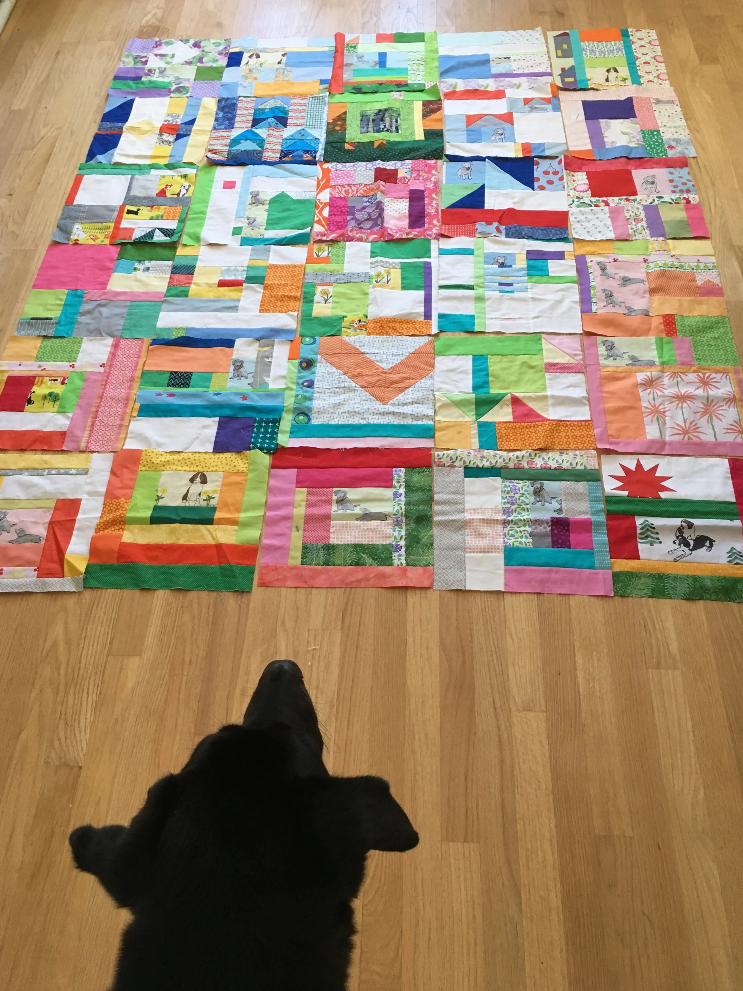 the 30 blocks of my Improv Scrappy Block Project 2017, with Hazel looking on