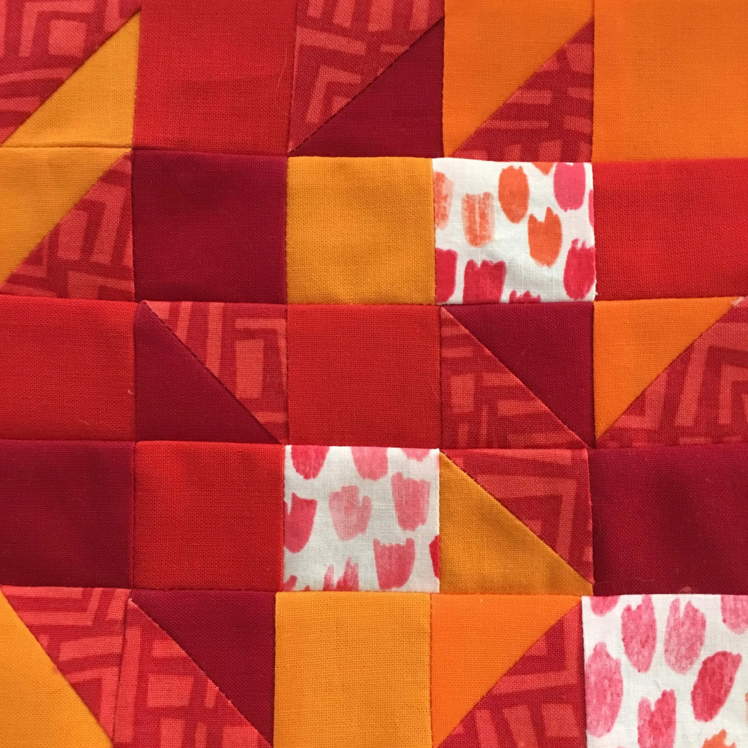 Analogous colors...they are colors that are right next to each other on the color wheel. Above is an example of a very warm palate. (It is August after all)! Orange, red orange, red. The pinks are tints of red and give the block added interest.