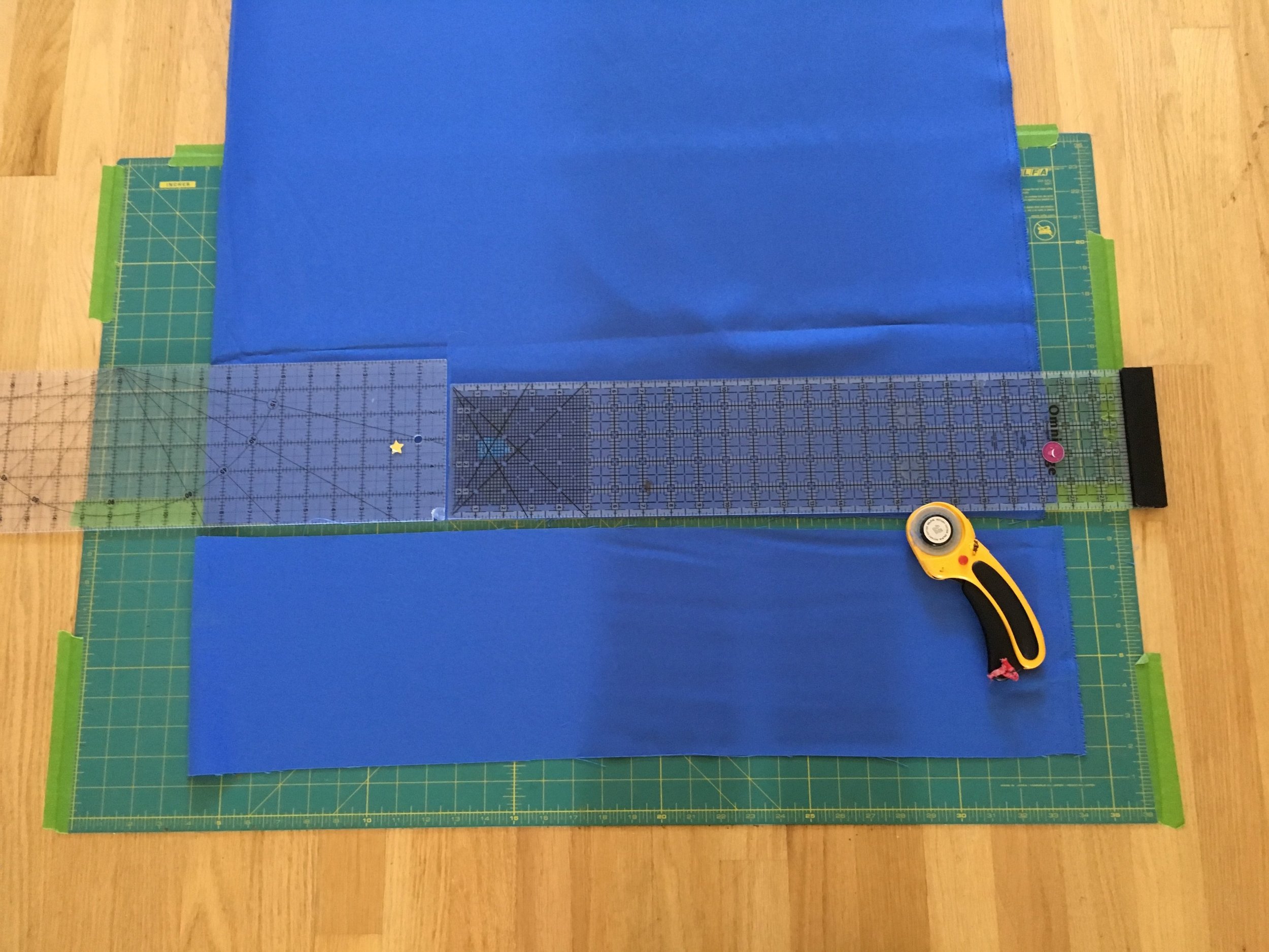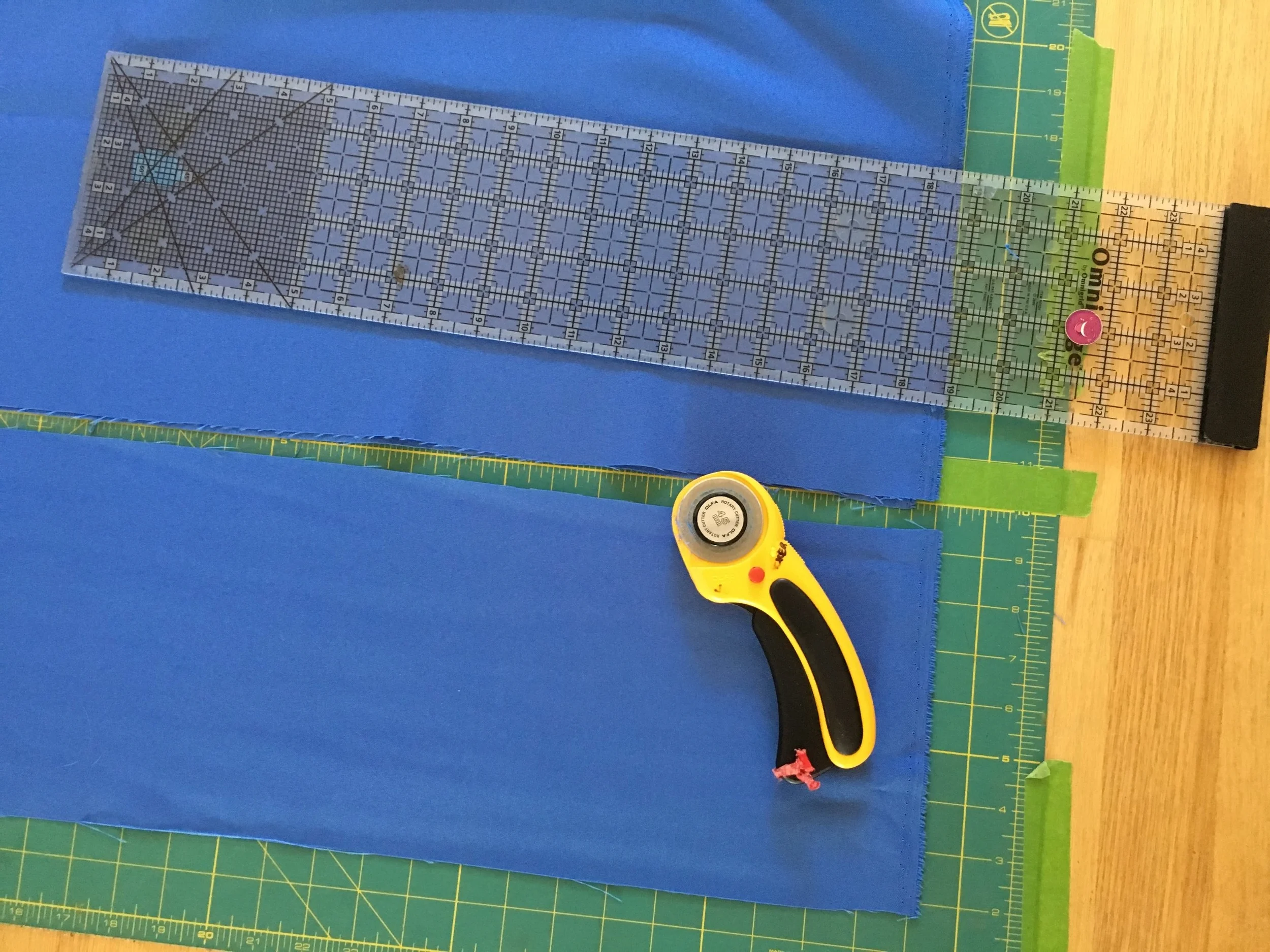 - Place a ruler over the fabric on the mat, lining it up with the LOWER edge of the tape used to mark the cutting line on the mat. (My fabric was 60 wide so I needed to use 2 rulers to reach across the width of fabric). Cut across the width of fabric with a rotary cutter.