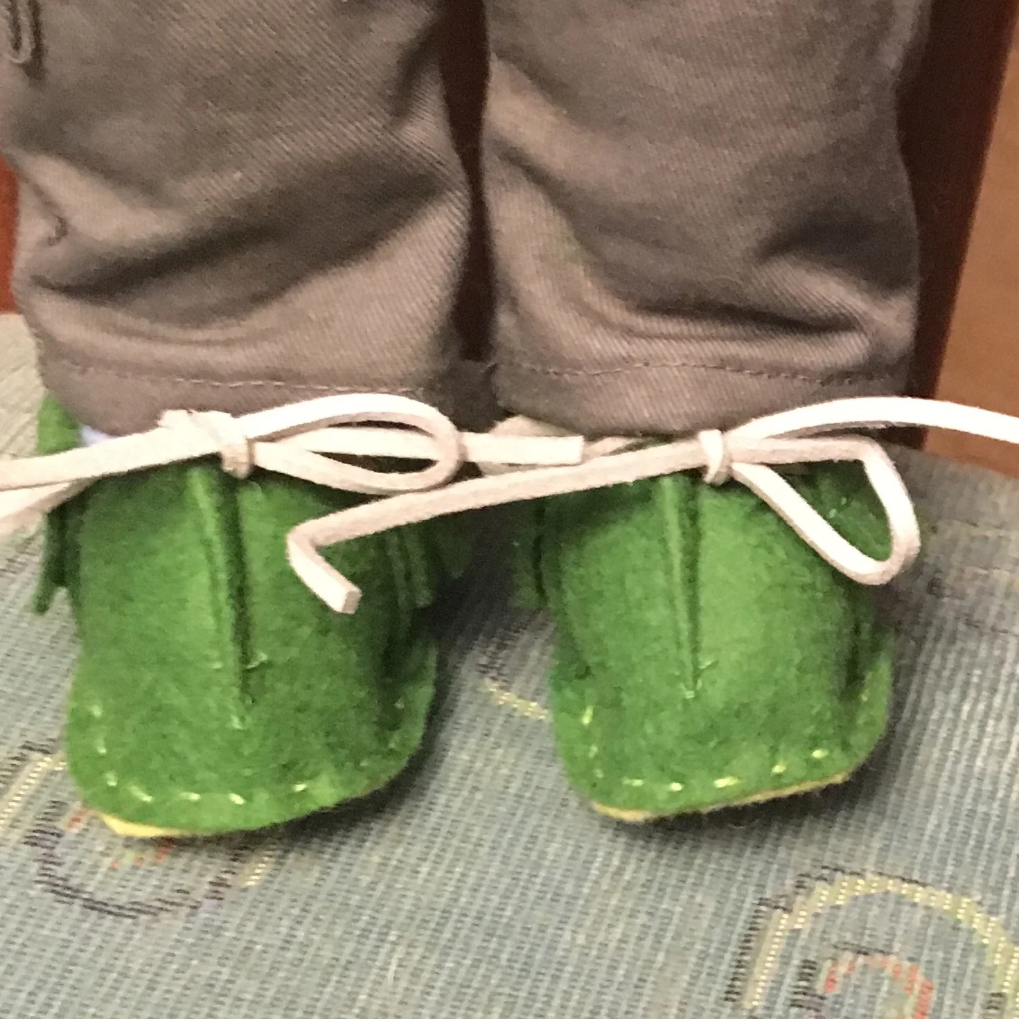 Here are his moccasins. If found some rawhide laces for crafts at Joann's. They are rated safe for children age 14 and older. Fine for my doll, but not something for a young child. But they sure are cute!!