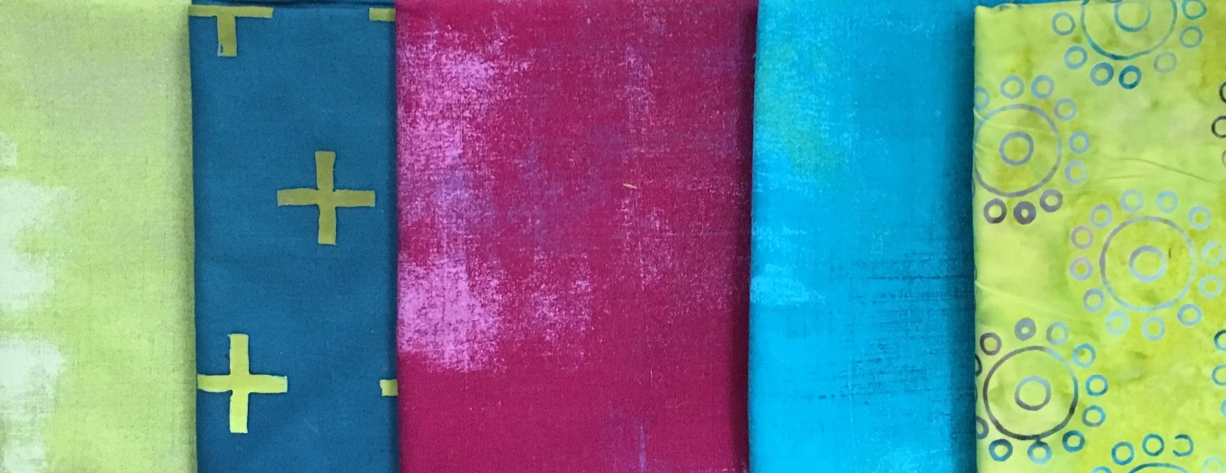 This year my package contained these 5 half yards of fabric. A creative, generous gift. One Alison Glass Handcrafted fabric, two grunge fabrics and one coordinating batik. Three of the colors are in my palette: the maroon way out of my comfort zone! What to do with them?