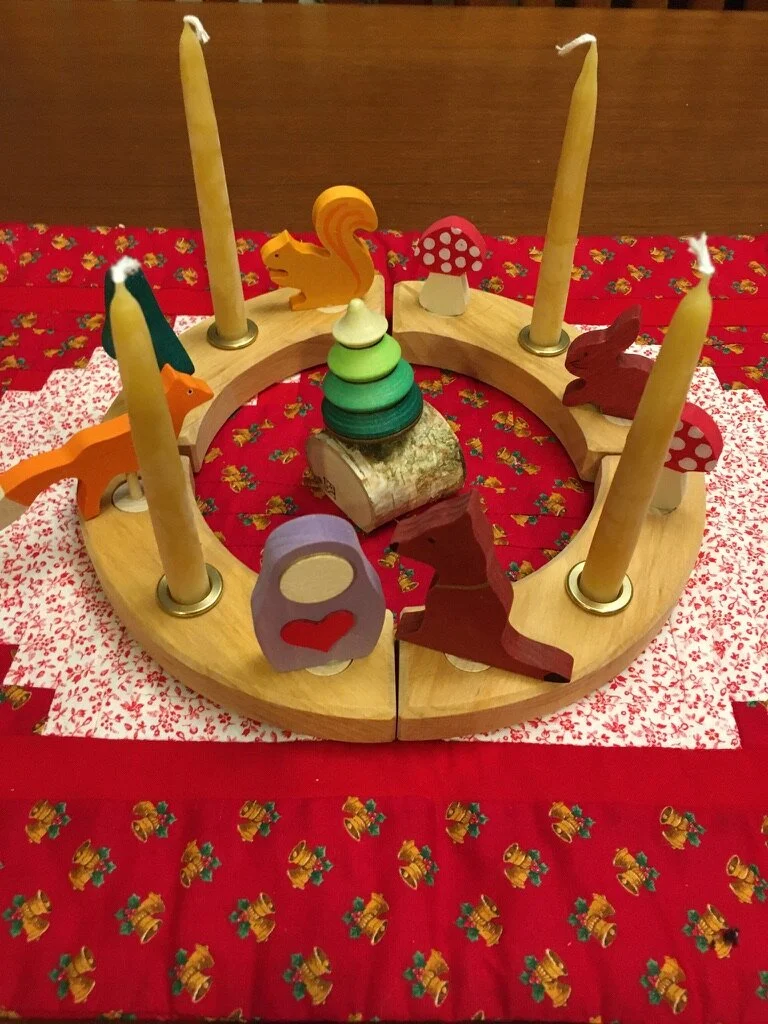If you purchase a ring and wish to use candles, make sure to also buy the brass (or other metal) inserts. The holes for the peg figures are too large to hold the beeswax candles. (The candles aren’t lit in my pictures because I have 3 intermittently bouncy dogs).