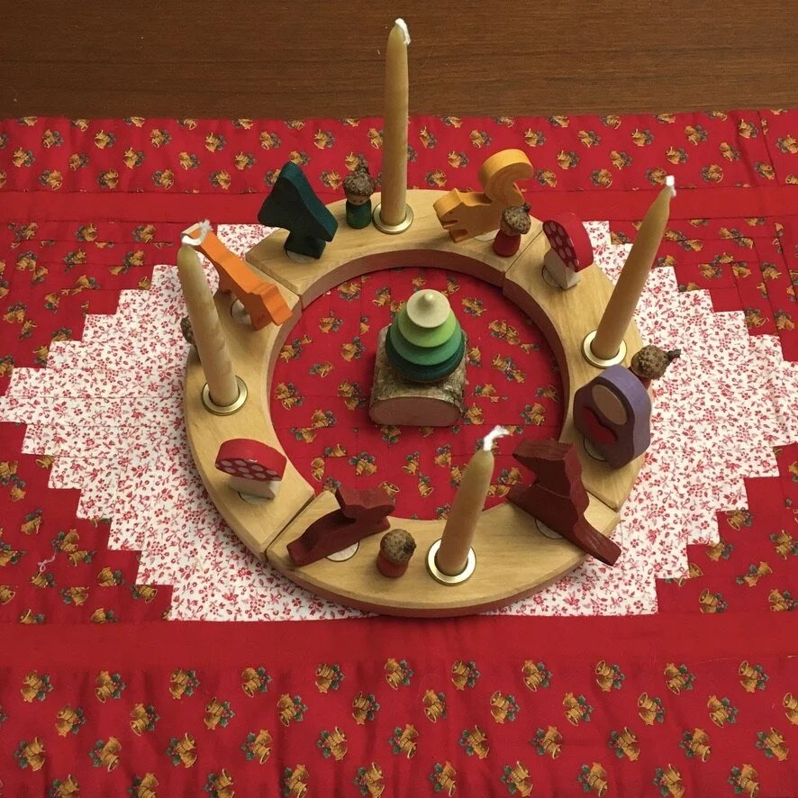 I recently purchased Waldorf Birthday Ring from TheWoodenWagon.com. I’ve been admiring birthday rings for while. I’m using mine as a seasonal decoration. I purchased a fox, a dog, a squirrel, a rabbit, 2 mushrooms, a pine tree and a Matryoshka doll for my Christmas ring.