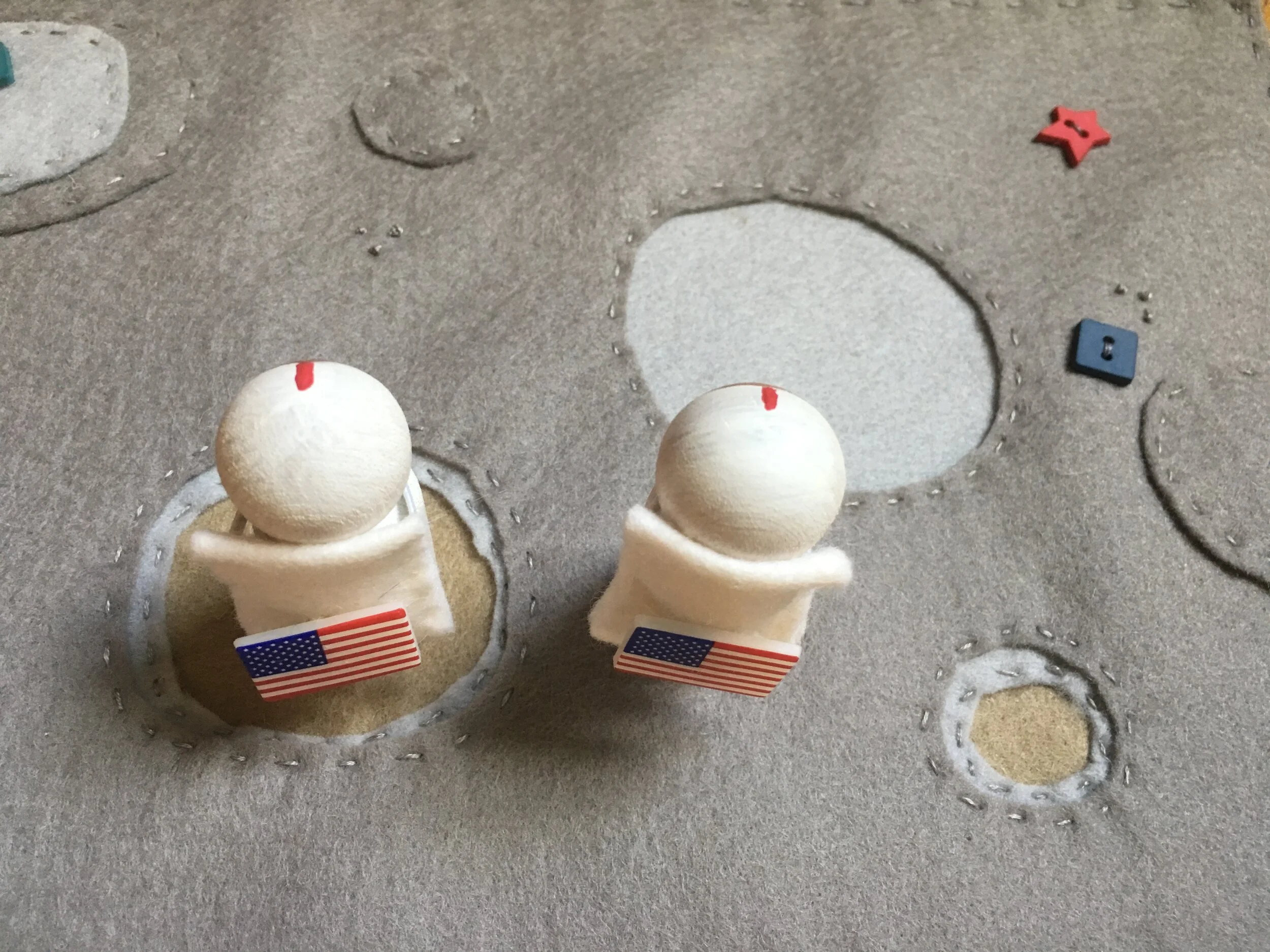 It was so much fun making the peg dolls. I used the standard size pegs. I picked Apollo era type suits and made felt life packs. The life pack is held on the doll by a 1/4 inch white elastic around the neck.
