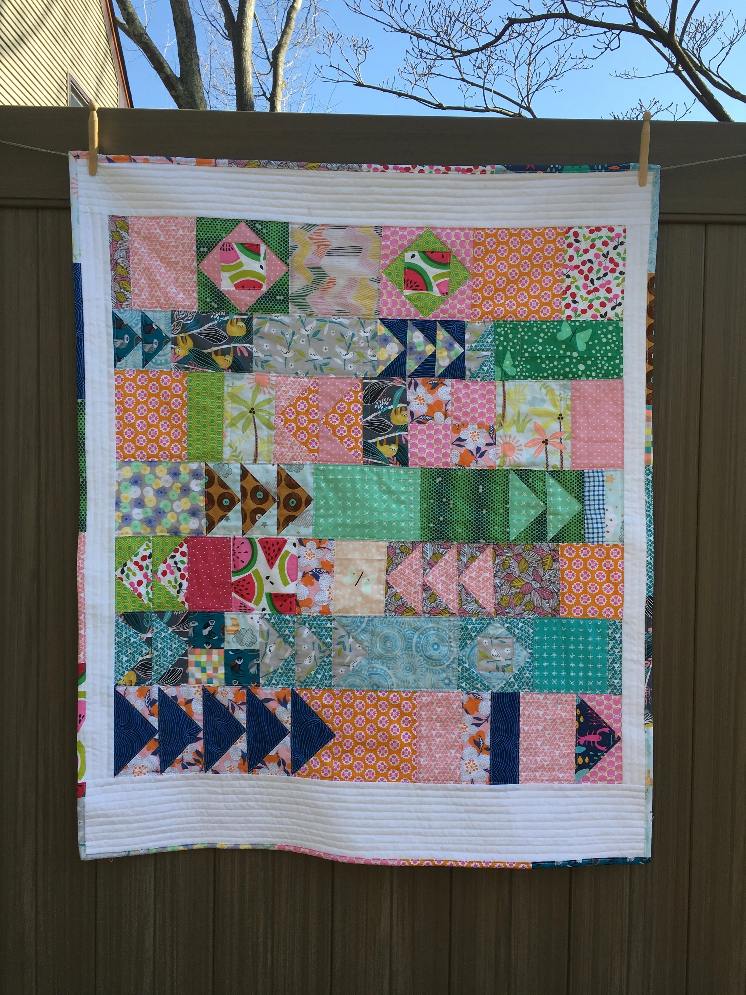 I did all the quilting with my walking foot. There is echo quilting around the flying geese and the economy blocks, and lines of quilting spaced in a variety of distances, from 1/2 to 1/8 inch, across the vertical width of the longer plain blocks.