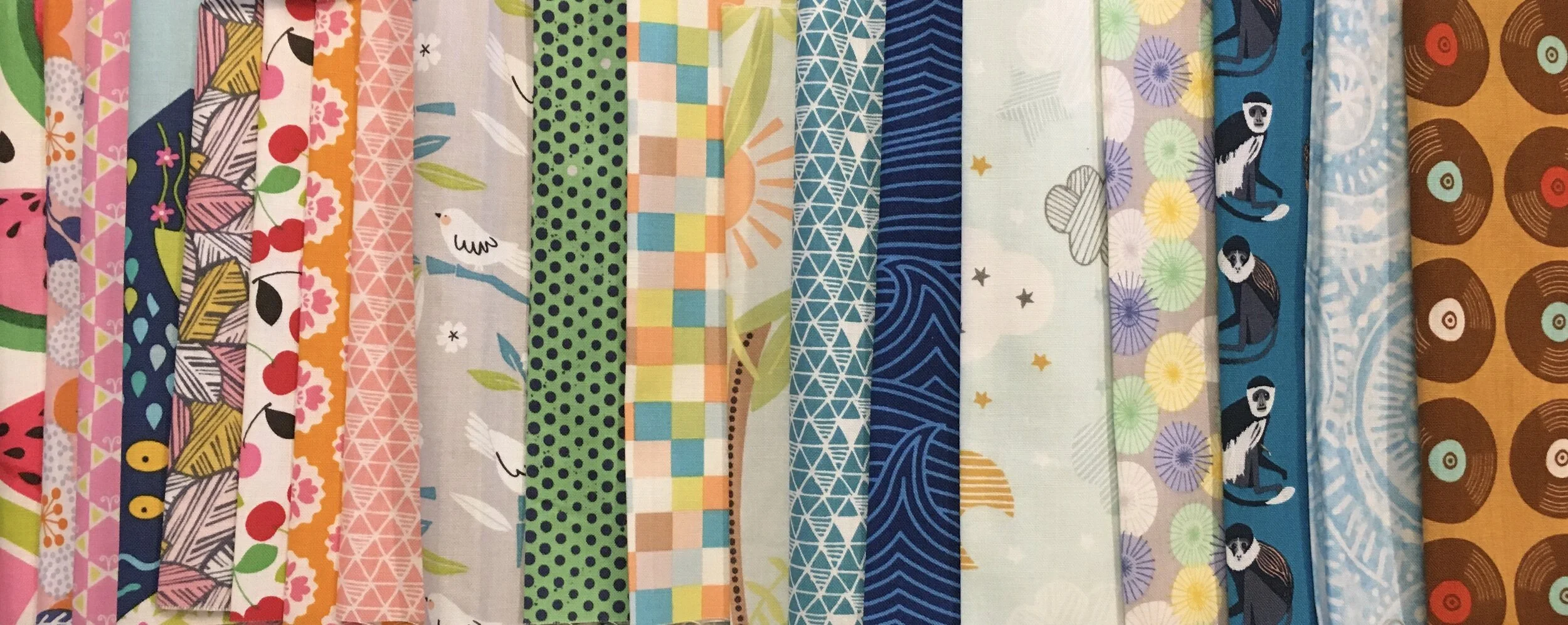 Below are 19 of the 20 fabrics in my bundle. The one that is missing from the photo is the fabric with the yellow sloths in row 2 of the quilt photo above.