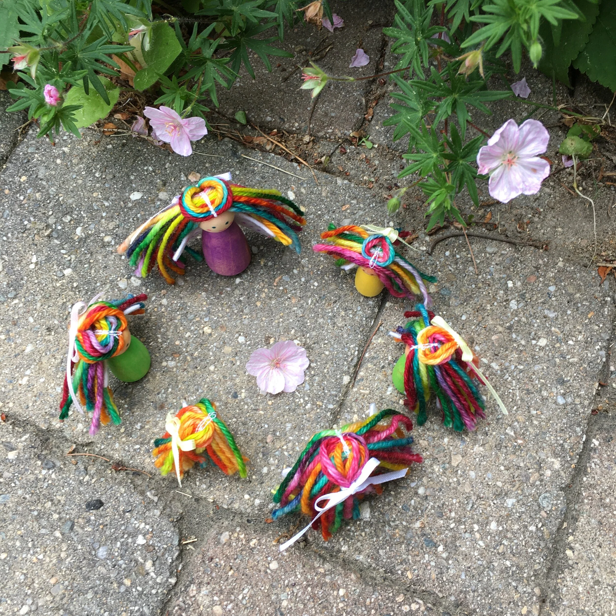 I made tiny, small and medium size peg dolls for these fairies. The hand dyed merino yarn, color is “Prism”, came from Alive with Purpose which supports mental health in Minnesota. This yarn has a very short color repeat. I wasn’t sure how I would use it when I bought it, but it’s perfect for peg doll hair!