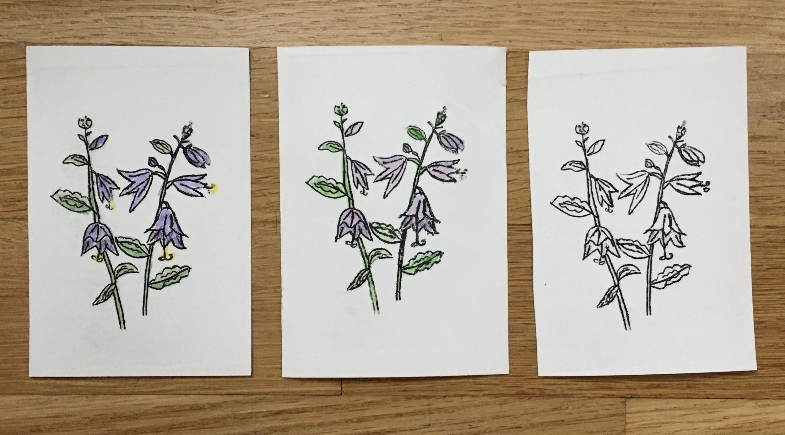 Second Row Left: I like using the Speedball printmaking paper. It’s readily available online in the US, not very expensive, and a great weight for making note cards. I have used mulberry paper but while it does make nice prints, it’s more expensive, definitely trickier to use, and much thinner weight. I’ve had good results using Akua® Intaglio® printing inks. (I’ve used both carbon black and a Prussian blue.