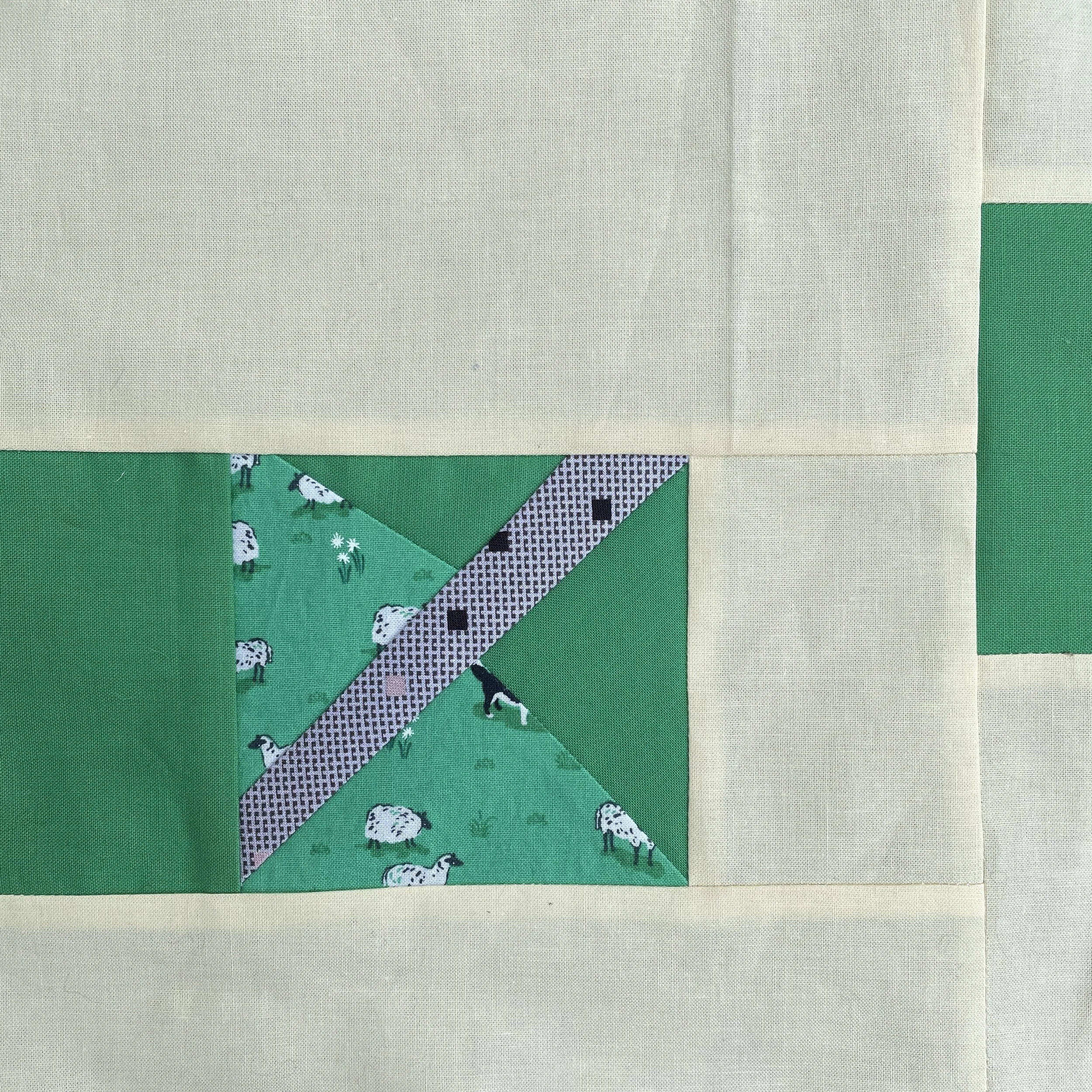 Some weeks Cheryl incorporates scraps from previous blocks. On week 19 she asked us to make a block using a triangle in our scraps. I used 4. The challenge in my block was getting to sheep to all be standing up! Unfortunately, the sheep dog is mostly out of view.