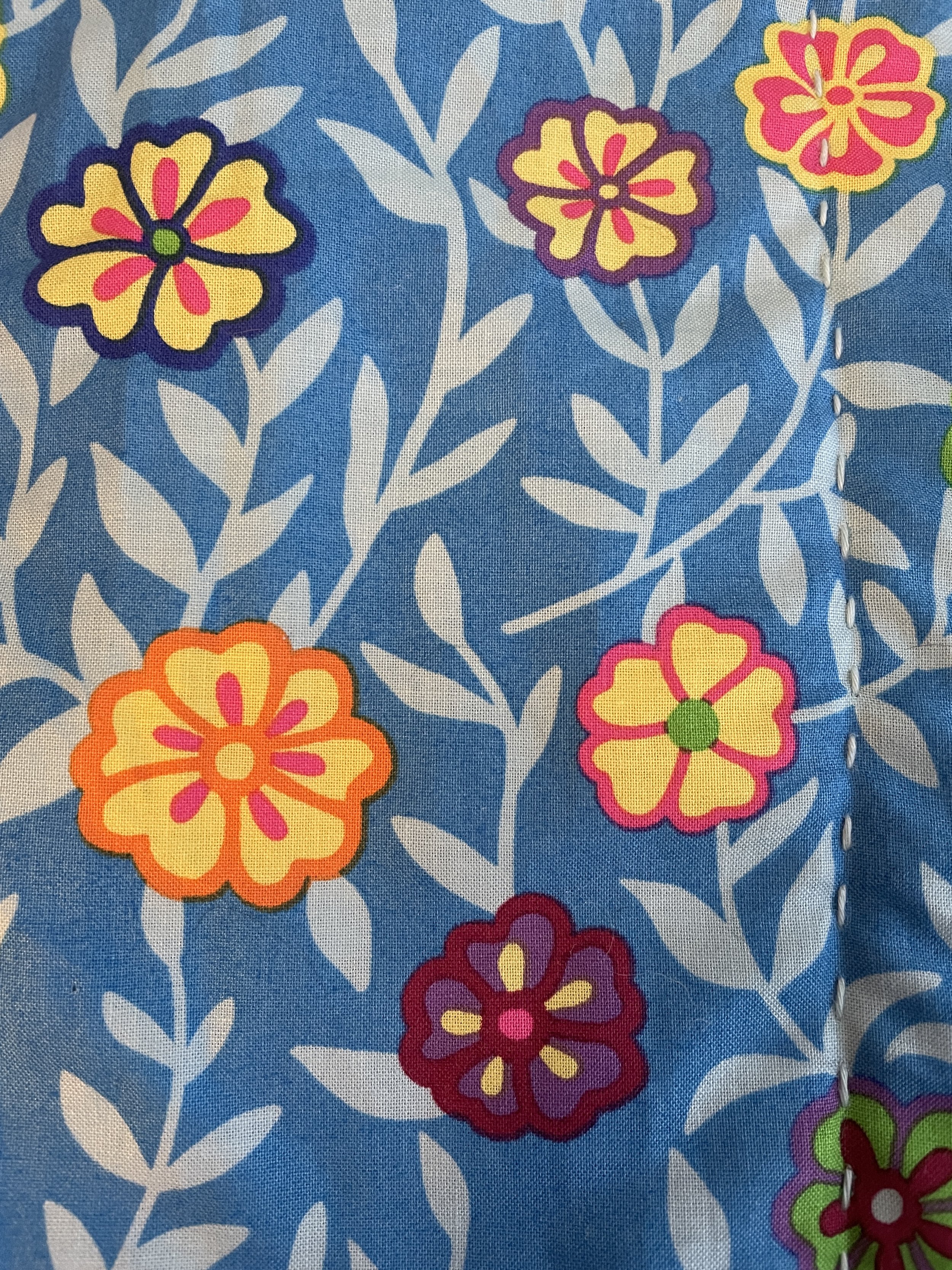 There are 3 types of quilting in this quilt. There is a lot of straight line quilting done with a walking foot. The flowers in the solid blocks are free motion quilting. And if you look very carefully, there is hand sewn big stitch quilting in most of the upright flower blocks. I used sashiko thread and a sashiko needle to do the hand stitching. The thread is almost exactly the same blue as the leaves in the print, so it’s only something you’d discover if you had the quilt on your lap!