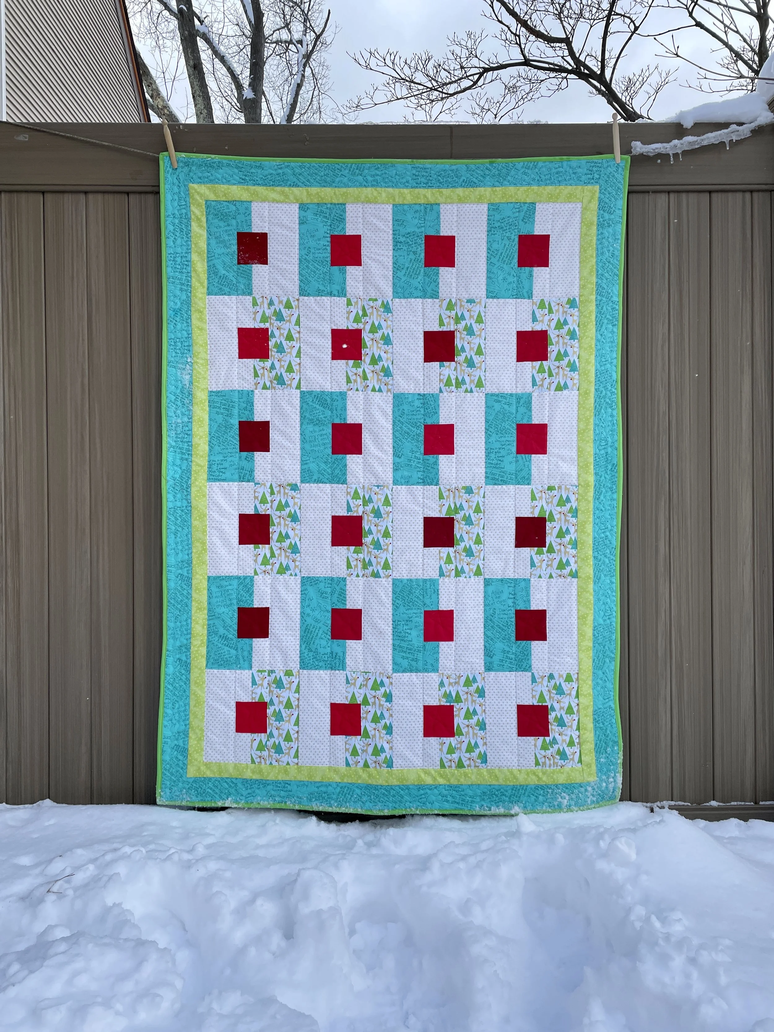 This is a three yard quilt pattern called “Attraction” from Fabric Café®. I struggled with piecing this quilt. It turns out this pattern isn’t meant to be used with a fabrics that have directional designs. Fortunately I realized that before I did any cutting so the trees and reindeer are all upright. What I didn’t realize until too late was that I needed to make half of the the reindeer blocks and half of teal blocks (which are letters to Santa) mirror images of each other. I think I missed that because all my squares are red, while in the pattern, the squares are two different colors and they switch back and forth. I’ve used this pattern before and i did piece it correctly in this quilt using “Tula’s True Colors”.