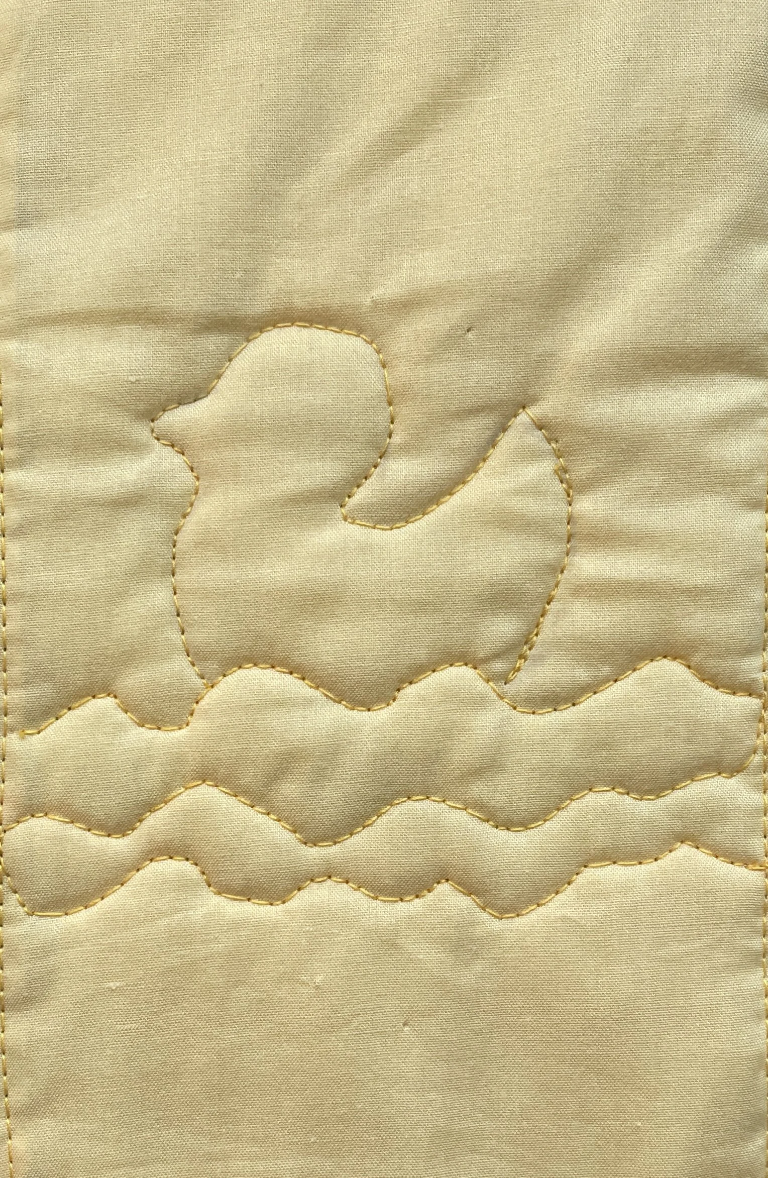 And to add to the fun, I added 3 floating rubber duckies in the solid yellow blocks using free motion quilting. The quilt has a polyester batting which adds fullness to the quilted duck.