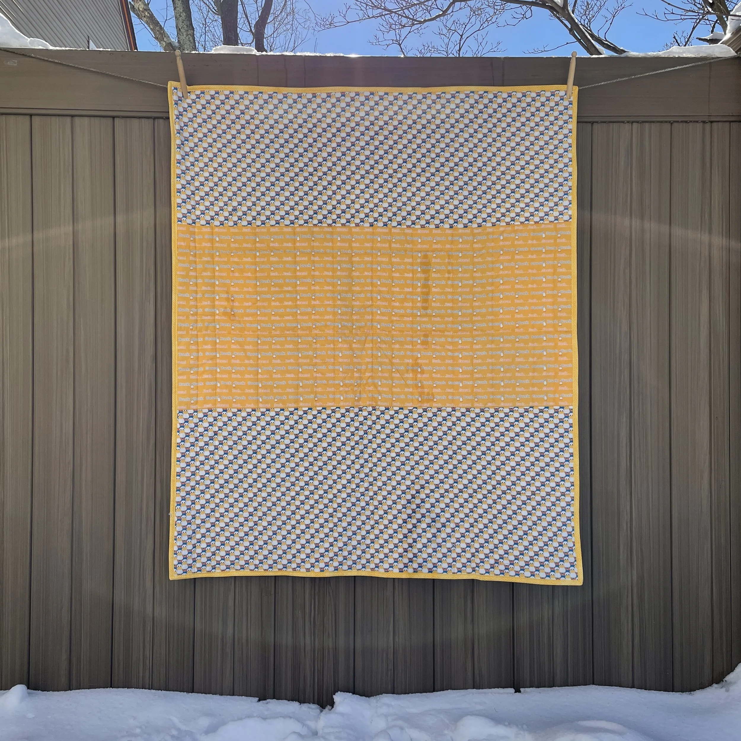 Back of the Duck Duck Goose quilt. Looks like the fence had some melting snow which got on the back while I was photographing the front. The joys of photographing in the winter…but it sure beats Mud Season which follows!