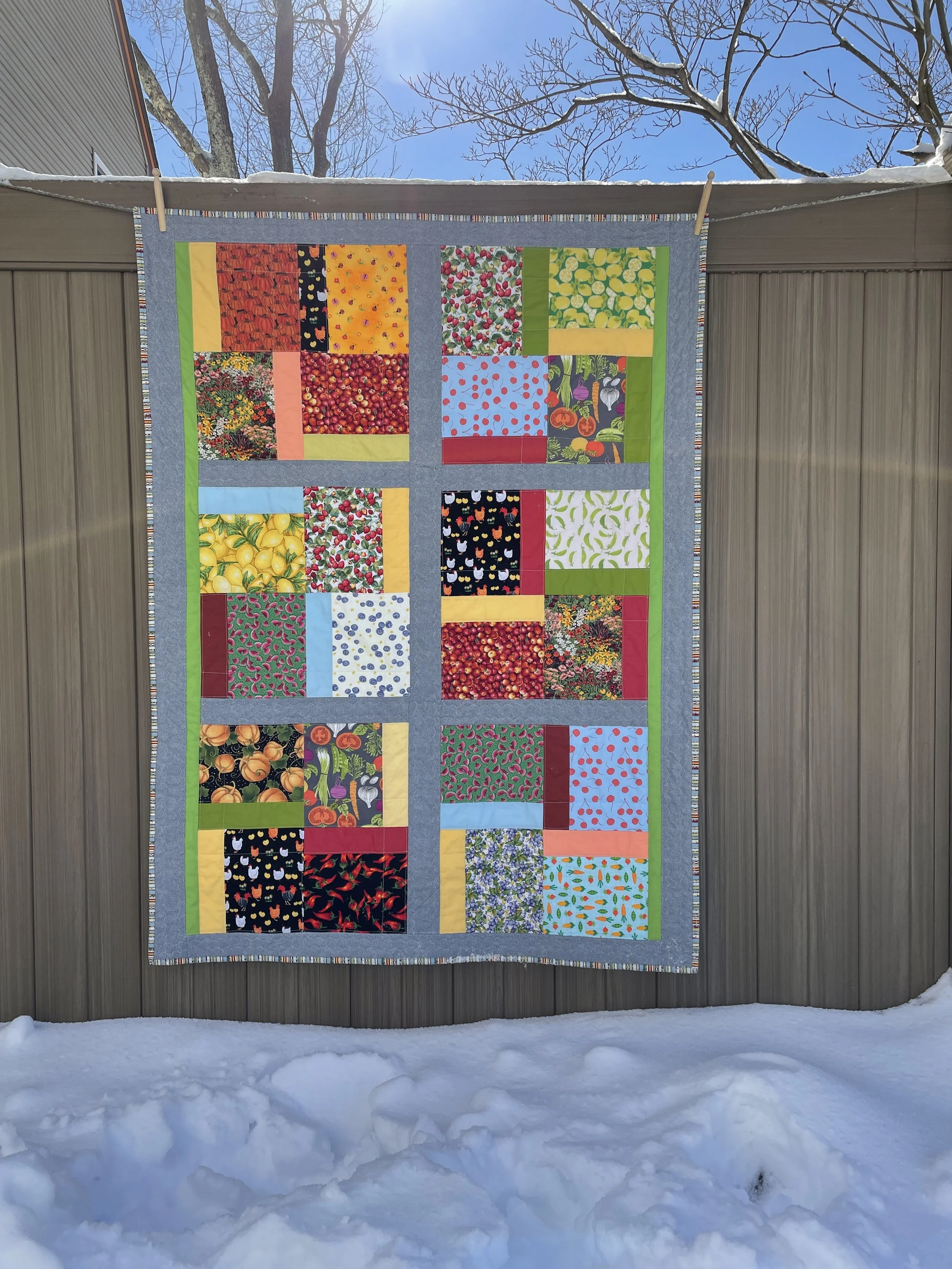 This is my Urban Allotment Quilt. I made it for my neighbors who created a rather unique little vegetable garden in their front yard. They are moving out of the city and will have lots of room for a really big garden on their new property. But this quilt will be a reminder of their little urban garden, which somehow, our neighborhood ground hog never found. One of life’s great mysteries!