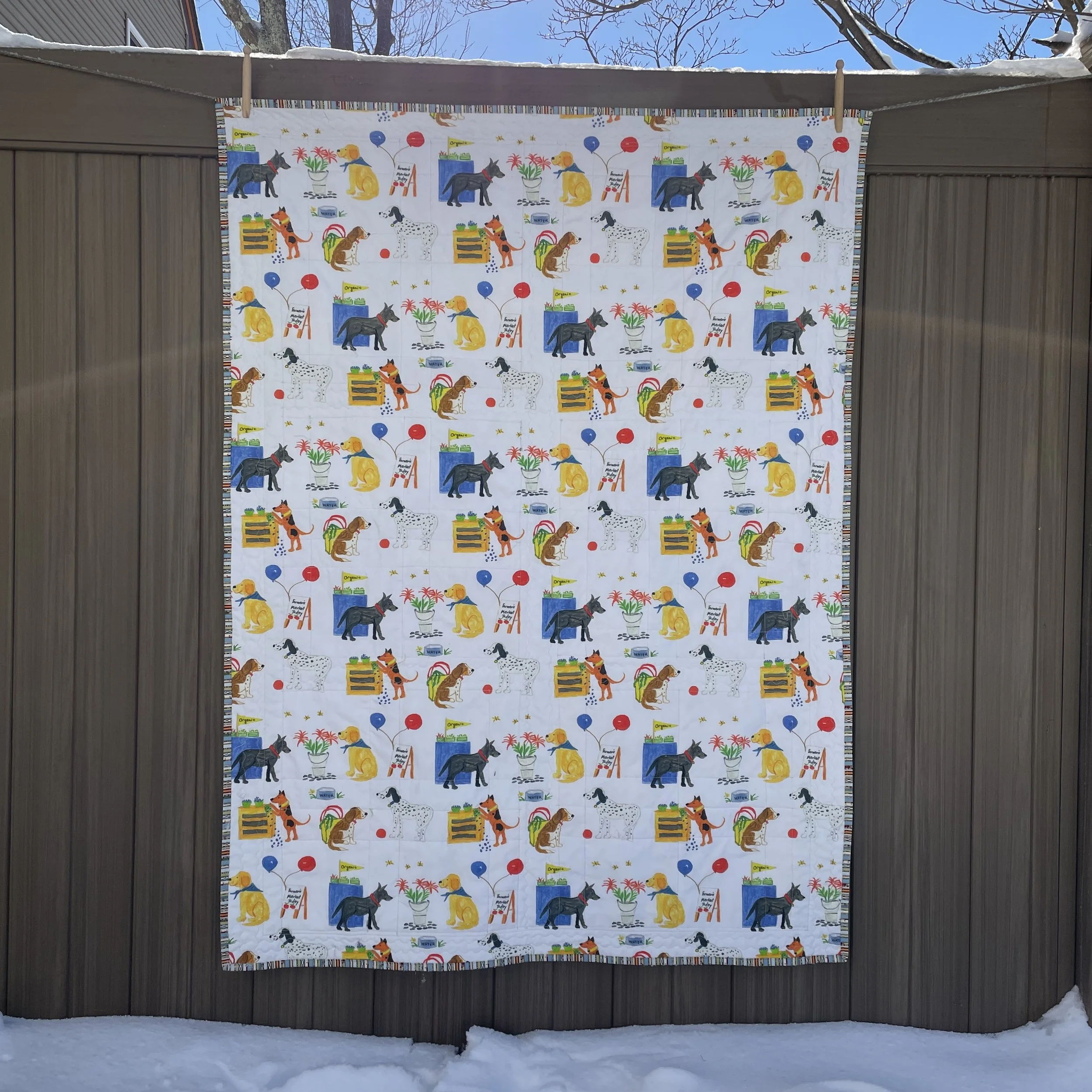 Back in 2015, I made another quilt using the Dogs at my Farmer’s Market Market, fussy cutting the fabrics to make the quilt blocks. This new quilt is very different and it was fun to use the fabrics in a new way.