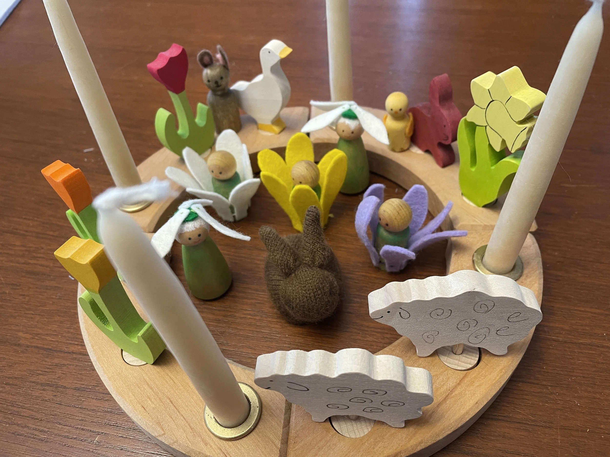 Here the new spring bulb pegs in my Spring-themed Waldorf Birthday Ring. They are joining last year’s bunny and chick peg dolls!