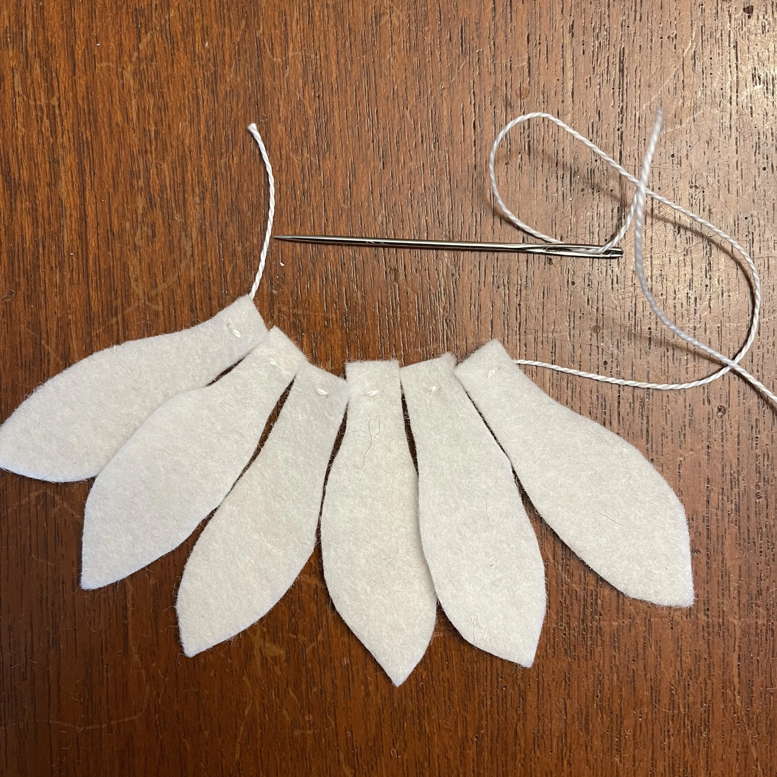 The three petals were cut from white wool felt and sewed onto a little circle of green felt. Then I glued the petal cap to the peg doll’s head. And yes, they do look like snowdrops!