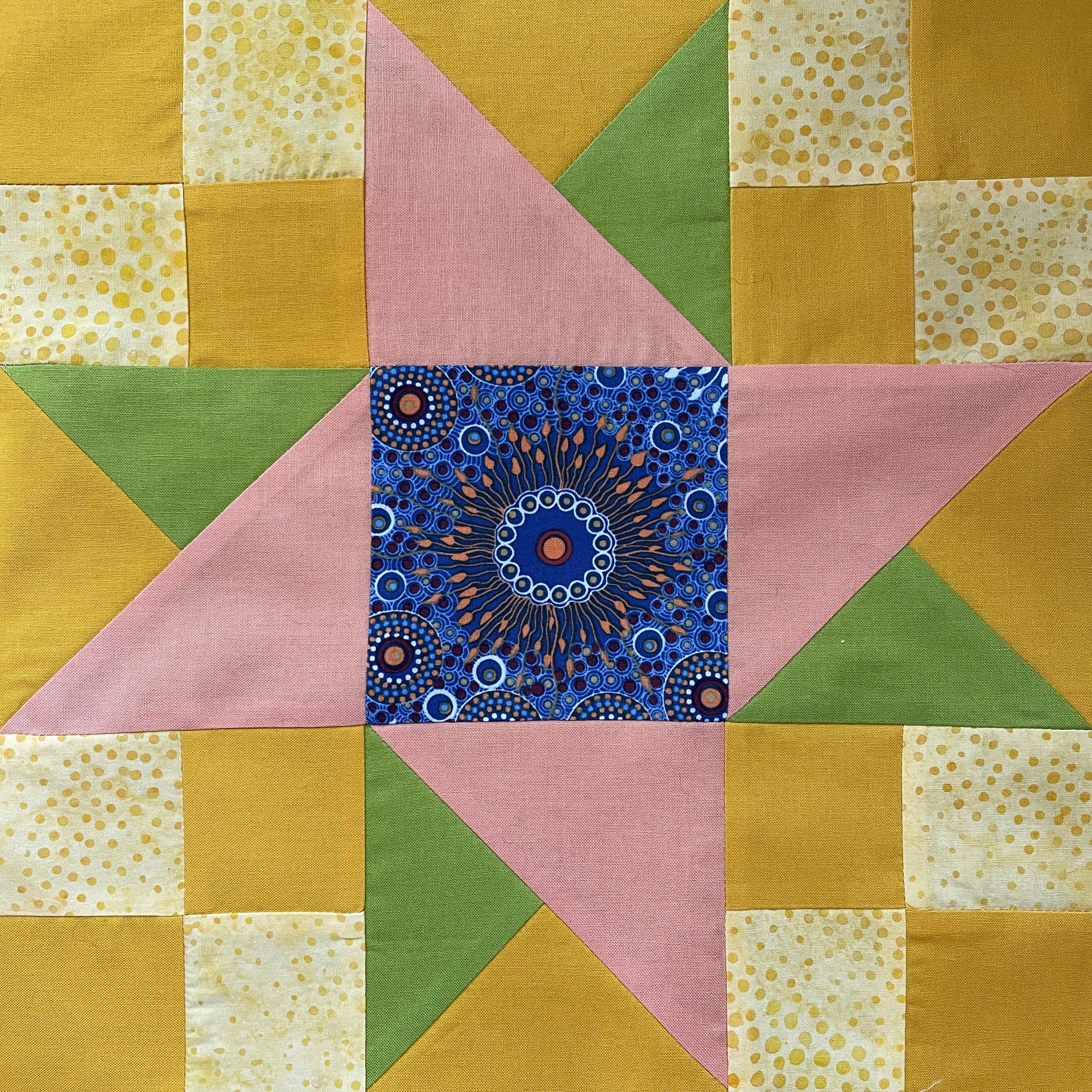 Today I want to share where I’ve gotten on my self-starting Monday Block project. I’ve passed the 12-block-point, which was one of my places where I might have stopped and assembled the quilt. But I still have lots of the Aboriginal fabrics and blocks I’d like to make. So now my goal is 20 blocks in total.