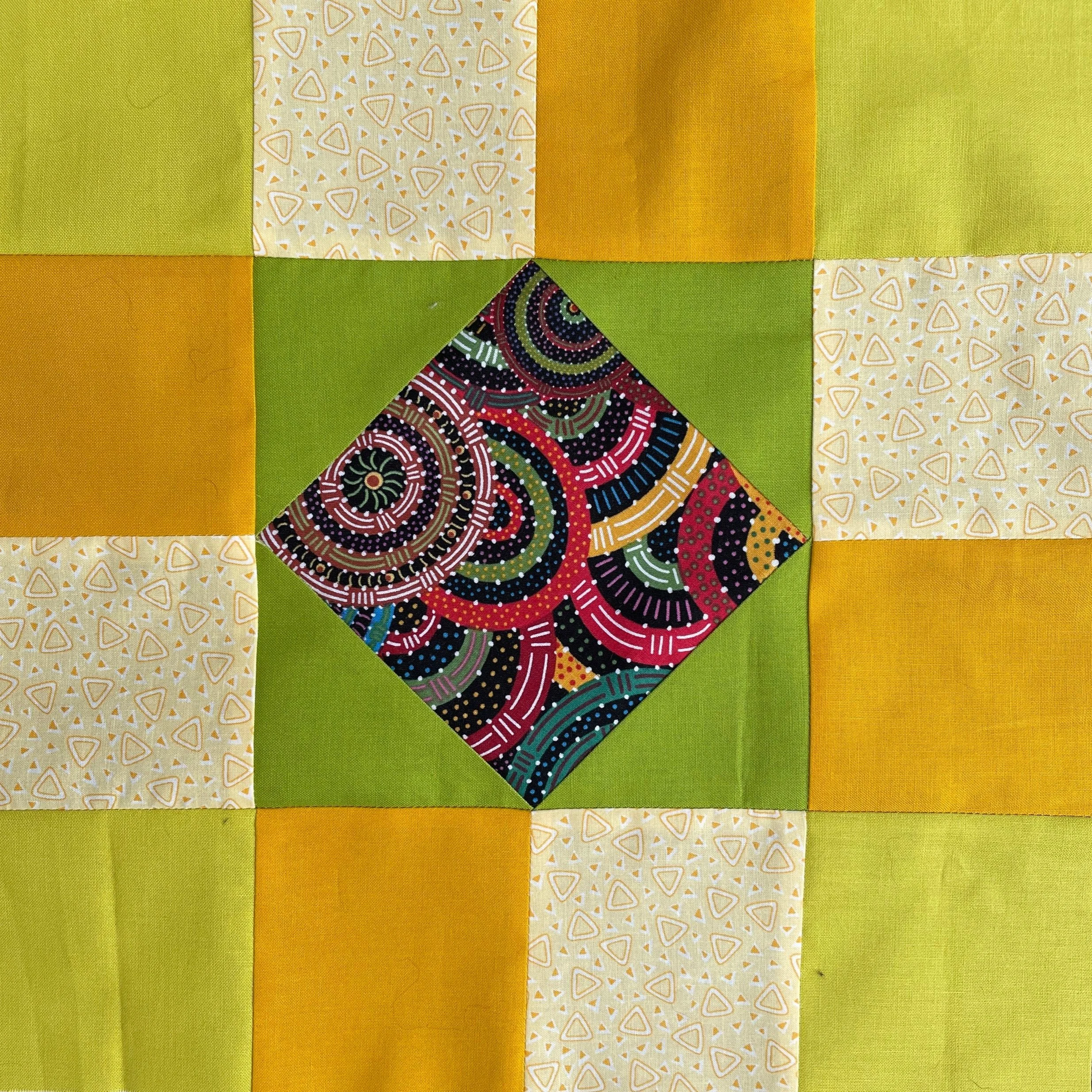 Wow! My Monday Block Project just flew by! All 20 of the blocks I chose to make incorporating Australian Aboriginal prints are now done! I still don’t know how I am going to put them together in a quilt yet, or what sort of fabric I’ll use. Finding a fabric that coordinates with all these blocks is going to be a challenge!
