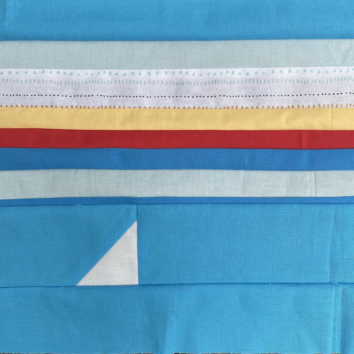 I initially just sewed strips of color together to make a block that looked just like the photo. But then decided that it would be a much better block if I added one white sail to the foreground. So I picked out the seam of the bottom blue strip and added the white triangle. Due to the additional seams around the sail, the block got smaller, but the blocks in this improv quilt are all different sizes, so this size of this block doesn’t really matter.