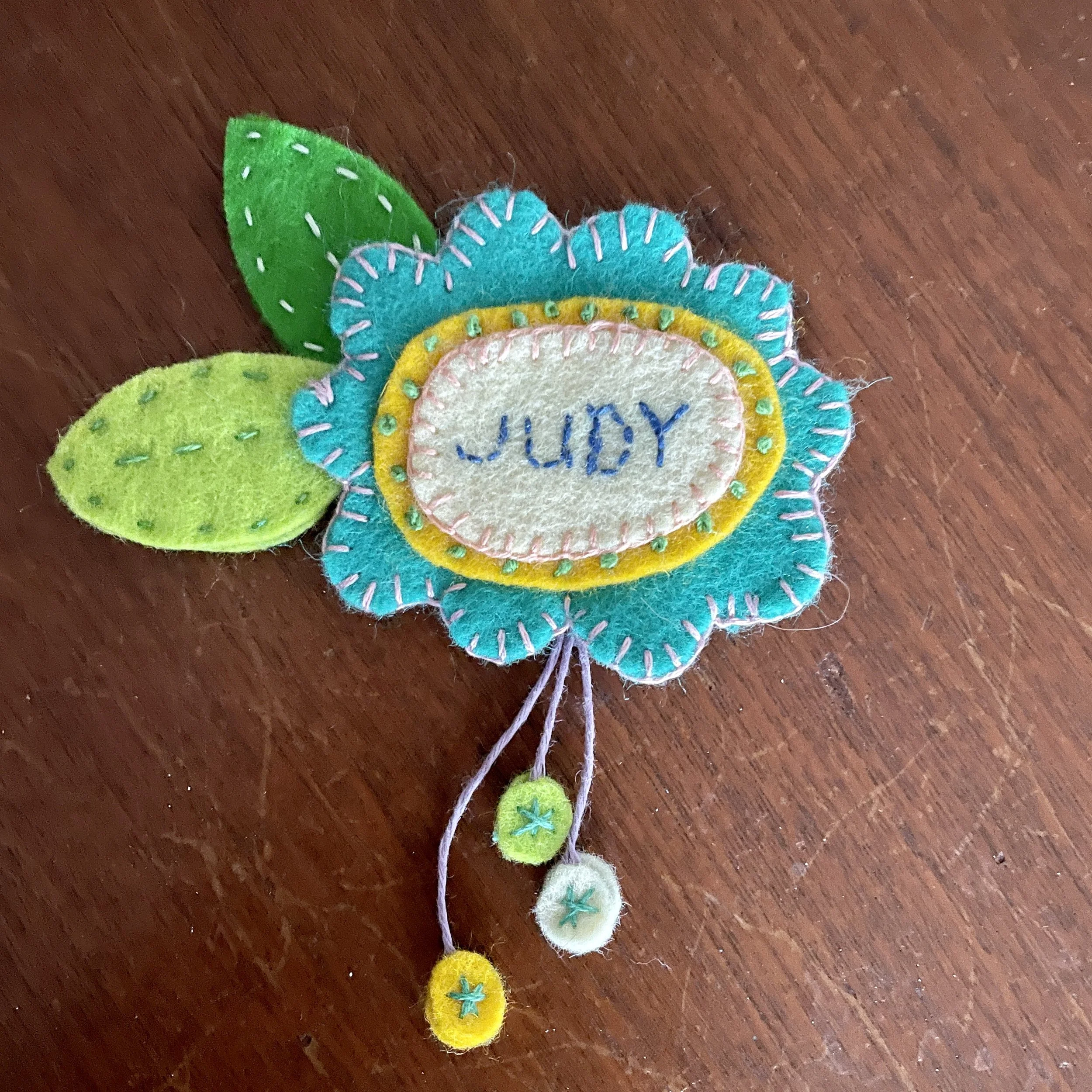 The third project, offered by Jo Avery, was a felt floral broach which I made into a name tag. Because of my peg doll projects I have a lovely stash of wool felt. So this project was right up my alley. What wasn’t, was embroidering my name! I’ve always struggled with that—there are just too many curves in the letters. This time I got tripped up on the D. I drew the letter with a vanishing fabric marker but it didn’t translate into thread as I hoped. Oh well, it’s “organic” and “homemade”… aren’t those supposed to be prized assets?