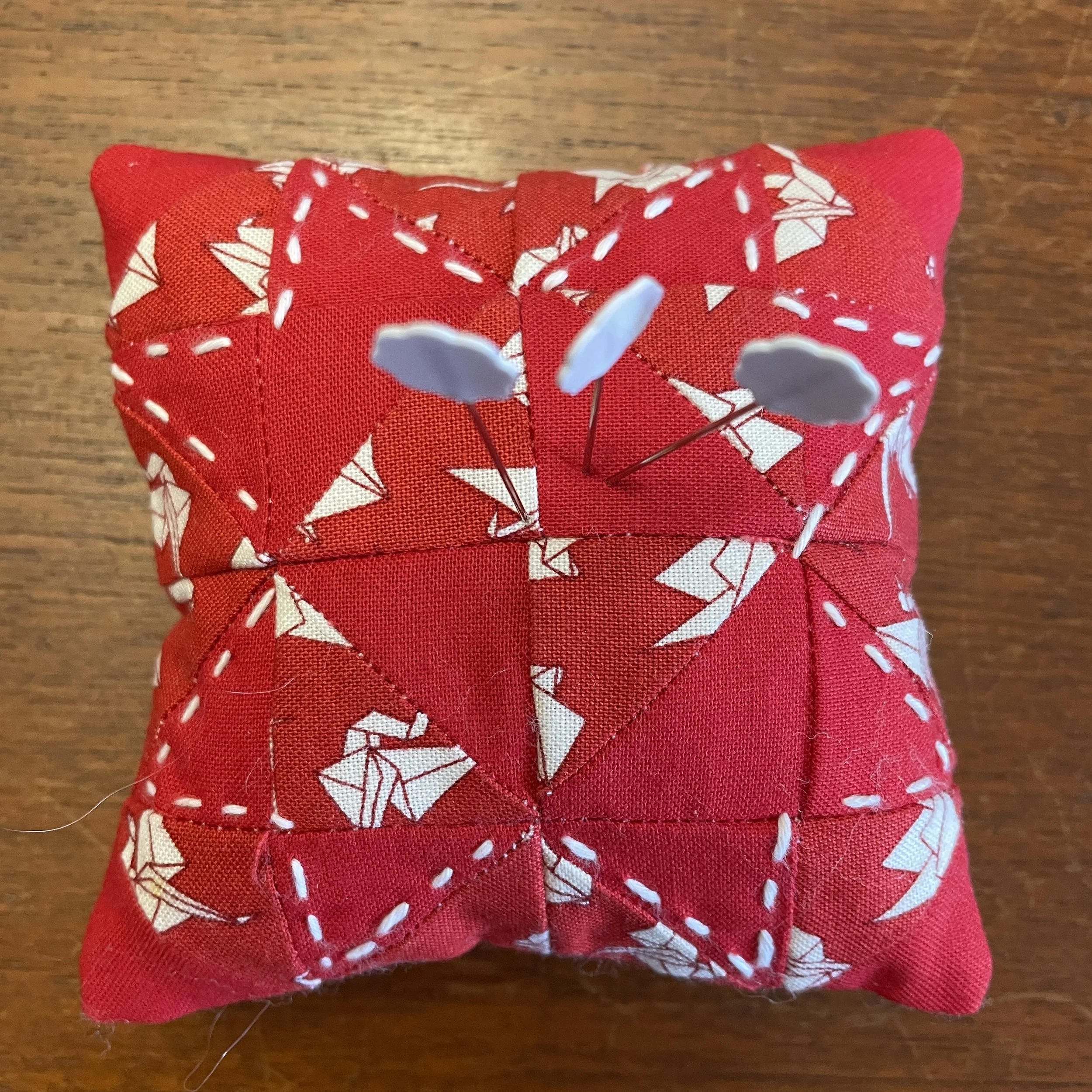 For the Threadhouse weekend, she offered a pincushion project using her 1 inch square half square triangle templates. She made her samples out of Liberty Lawn which is a perfect choice for these tiny blocks. Her HSQ template is amazing…my fabric choice, not so much! I knew I needed a little print. But little was too big—it needed to be tiny. My origami storks looked great next to the red solid but they didn’t work in these tiny blocks. So I outlined the star design I chose with Shashiko thread to give the pattern a little bit of definition. Not great, but hey, it’s pincushion! And now I know how awesome her printed HST templates are!
