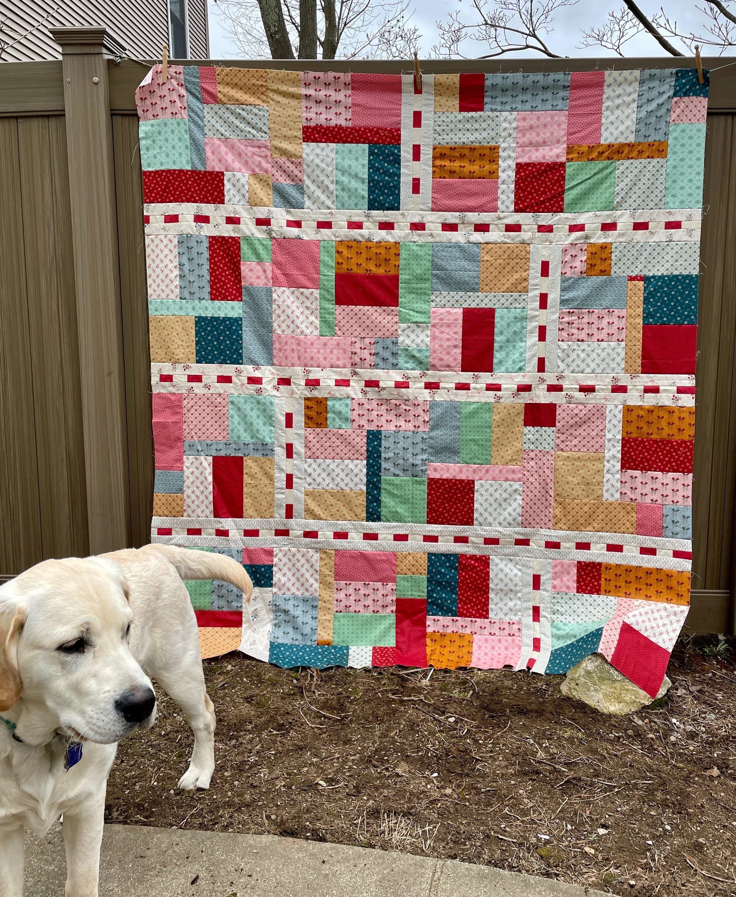 The puppy is 7 months old this week so sewing time is limited. On Saturday I gave him his first raw meaty marrow bone and he gave me 2 1/2 hours of unbroken silence (except for chewing sounds) which allowed me to finally put this quilt top together. Whew!!