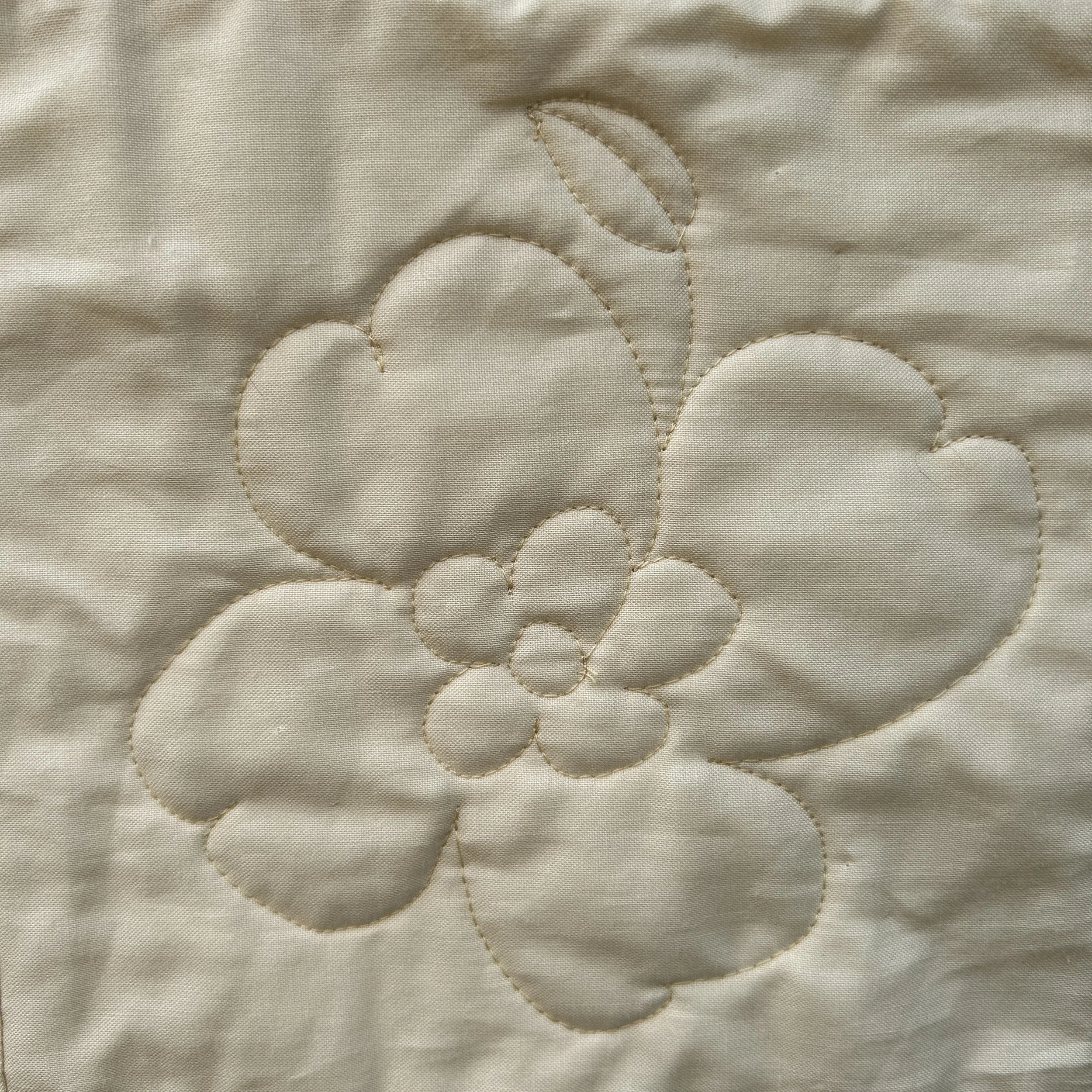 I also quilted a free motion design with hearts over the floral blocks. You can see it better on the back of the quilt in the photo below. I really liked the idea of that design I created for the block. It works well to quilt the block, but it didn’t turn out looking as good on the quilt as it did when I drew it on paper.