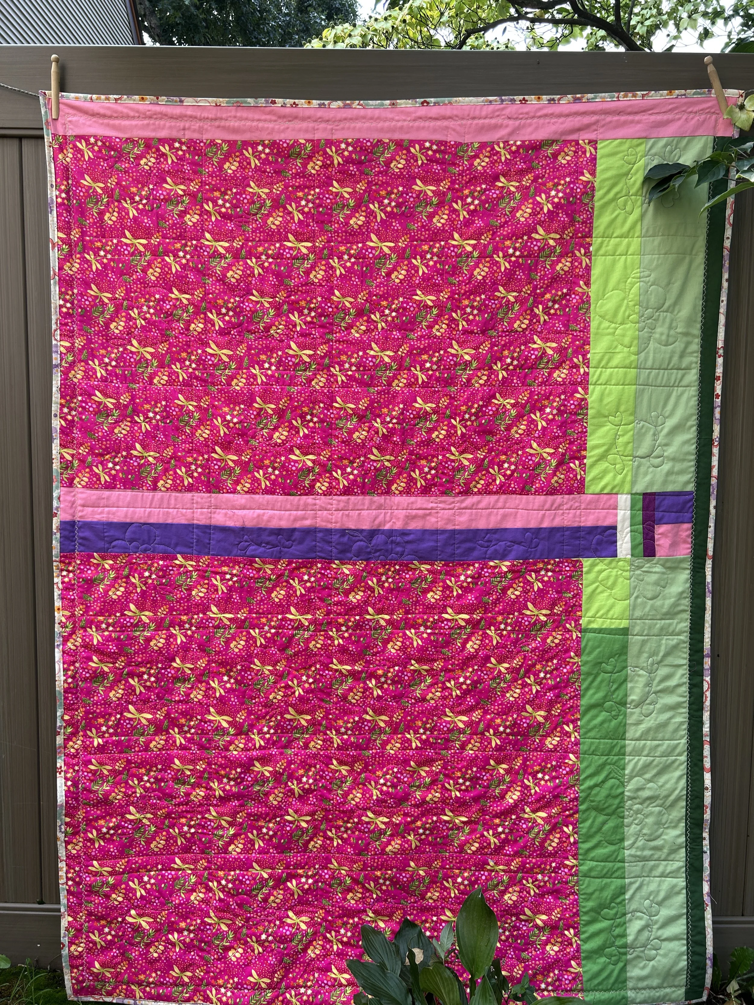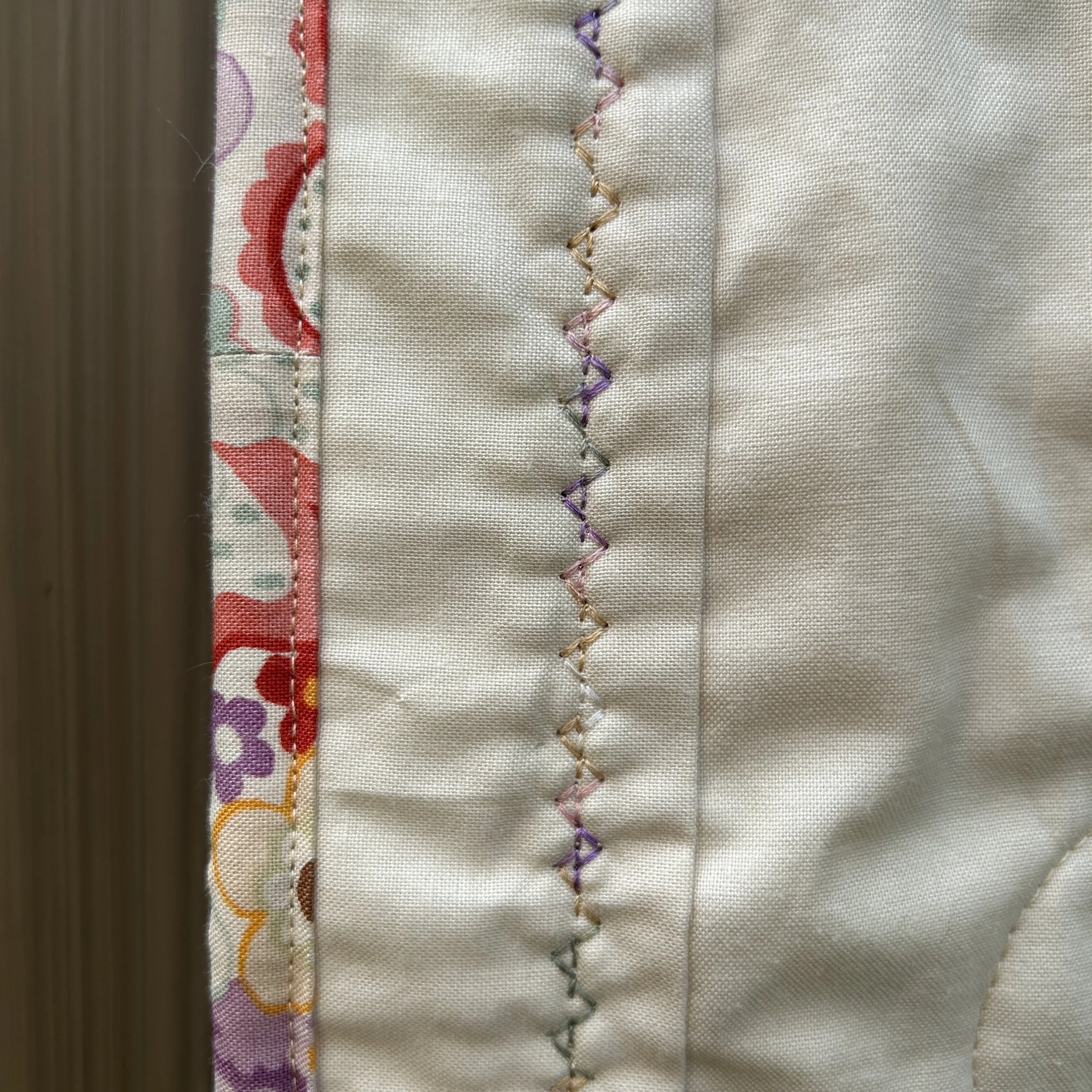 For the binding I used the medium sized floral fabric in the center of the blocks. I usually make solid color bindings or stripes, with the occasional tiny floral, polka dot or geometric. I think this is the first time I’ve ever used a mid-sized floral and I think that it works well. It also looks great with the variegated thread used with a decorative stitch on my outer border.