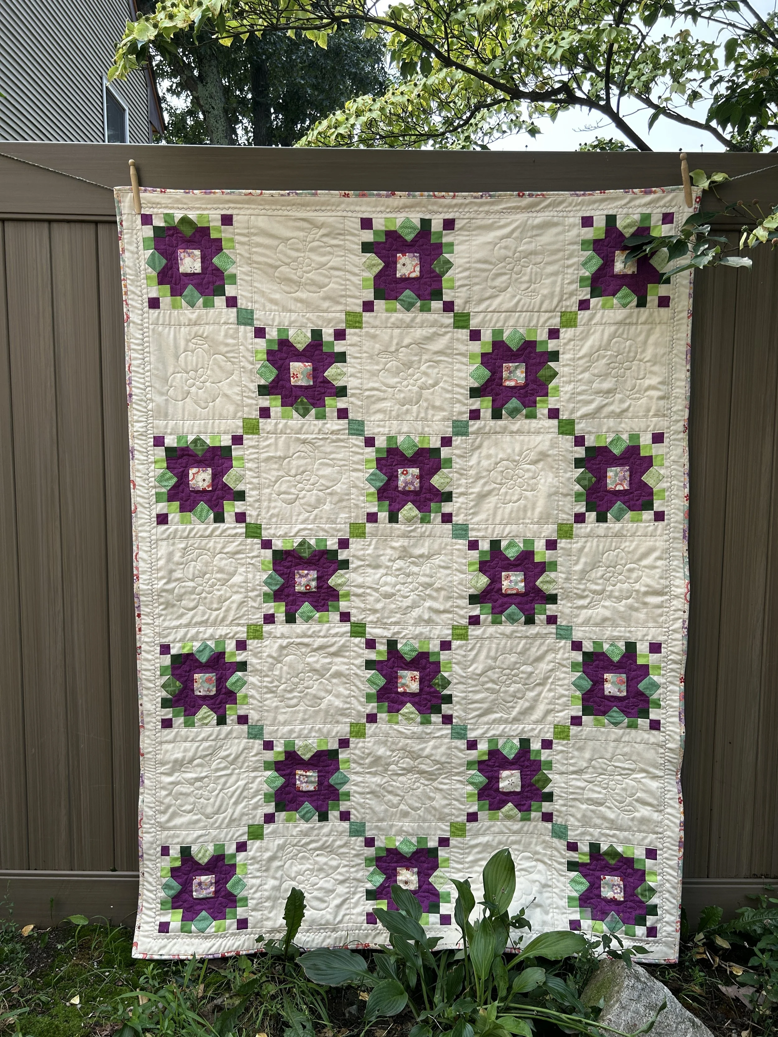 This also has turned out to be the year of free motion quilted flowers in the alternate blocks in my quilts. This time I tried to echo one of the floral designs in the fabric in the center of each of the violets. Free motion flowers are actually one of my favorite quilting designs. I find them easy to do, and really like how they look on a quilt.