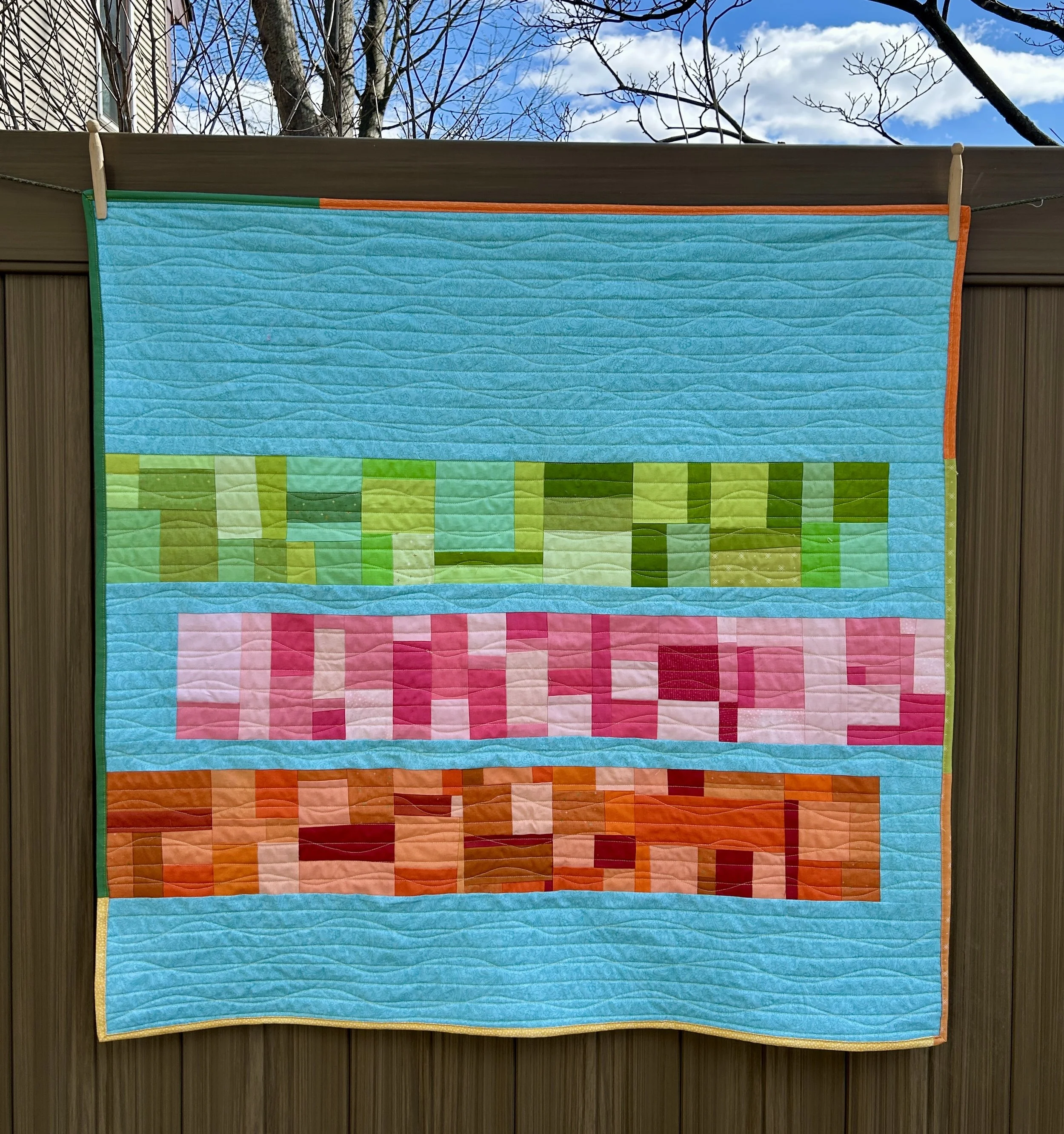 The quilt featured 3 bars which were improv pieced. The official quilt had the bars running from side to side. I wanted to make the quilt a bit larger, so I floated my bars. The colors were chosen to match the back of the quilt…which I know the child who gets it will consider the front!