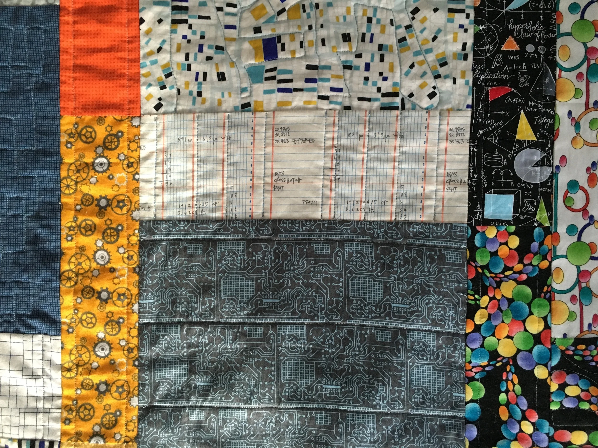 The Proper Bostonian Quilters Guild has a number of charity projects. One involves making quilts for specific kids, using a theme of their choice. I recently took a look at the list. One teenage boy had requested a quilt which was essentially a STEM theme. (STEM=Science, Technology, Engineering, Math). It had been on the list for a quite a long time. Who has STEM themed fabrics?