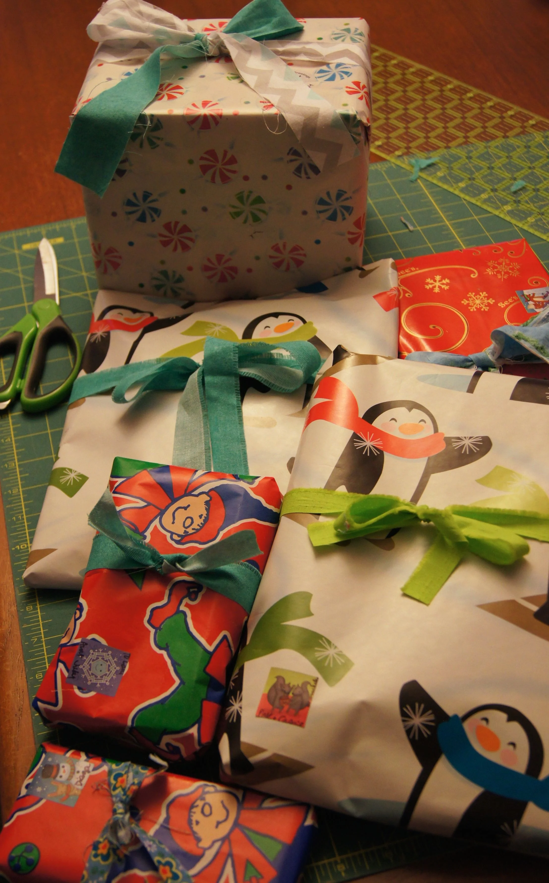 I settled down at my dining room table the other day to wrap holiday presents. The table is a nice big surface and it is where my cutting mat lives. I had brought out the wrapping paper but not the ribbons and I was at the point where I was ready to tie some bows.